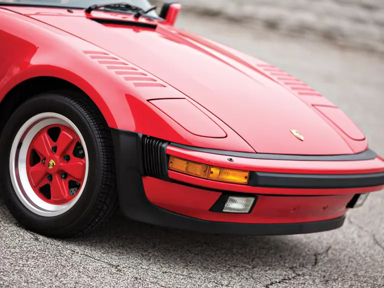 In that same period, a number of wealthy clients asked the factory to create street-legal versions of the brilliant 935 Group 5 car under its Special Wishes Program (Sonderwunschprogramm). They featured a flat, aerodynamic nose with retractable headlights, widened and louvered front fenders, more muscular rear quarters with air intakes and stylish “strakes,” extended and boxed rocker panels, an additional oil cooler, and a large rear spoiler, which housed an intercooler atop the engine lid. After 930s returned to the U.S. market in 1986, Porsche formalized the design the following year, with option number 505, also known as the 930S, for the U.S. market and option 506 for the Rest of the World, as Porsche called it. This option code could be ordered for an additional $23,244.