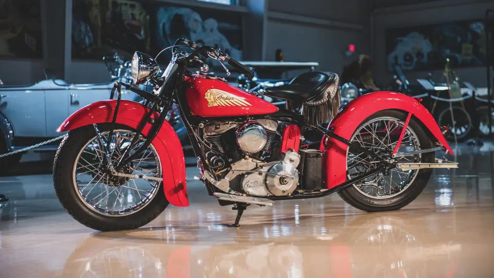 Introduced in 1922, the Indian Chief became the company’s principal model, a vee-twin of 1,200 cc. A front brake was added in 1928, the year the company was renamed Indian Motocycle Company [sic]. A new Easy-On gasoline cap became a very popular feature. Later additions were skirted fenders and a new sprung frame that predated Harley-Davidson’s rear suspension by two full decades. By 1950, however, the company was in dire straits and production ended in 1953.