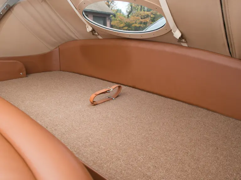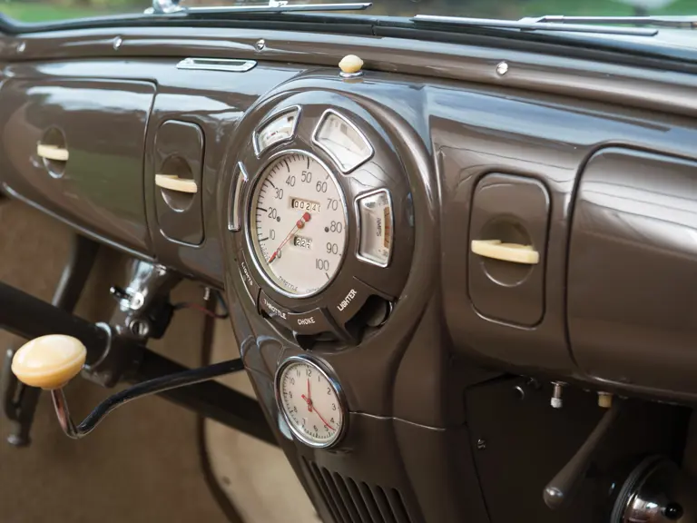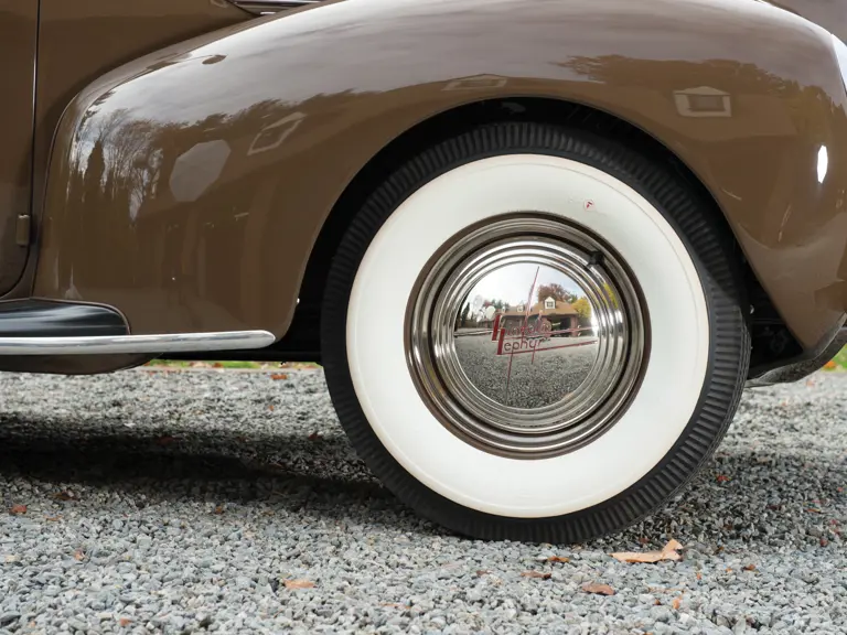 Most interesting is that this car is one of just 200 early-production Model 760 convertible coupes with no back seat, making it essentially a business coupe with a folding top. It was priced at $1,650 new and was the lowest priced Lincoln convertible in the lineup, yet it shared the handsome streamline styling of its more expensive siblings. Subsequent to the new model introduction for autumn, a five-passenger Lincoln Zephyr Convertible Coupe, Model 760B, superseded the original three-passenger version. This car wears body number 47, and according to the owner, it is the lowest production number 1938 Zephyr Convertible Coupe known to exist. It was restored to original condition, including its Wren Tan exterior paint, tan Haartz convertible top, and matching saddle tan leather interior and beige carpets. It is fitted with period-correct whitewall tires, making for an understated combination with the as-built color combination.