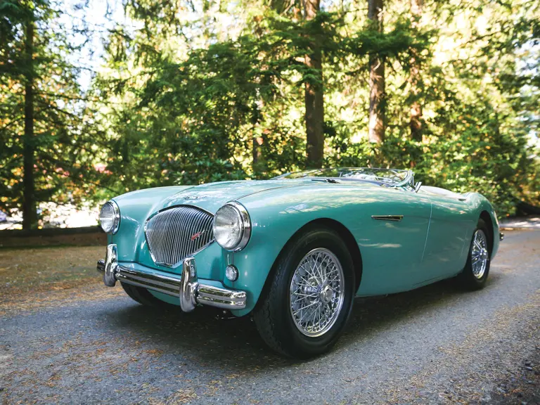 Finding a Healey 100 in Florida produced in July 1954, in complete condition, the consignor decided to create an ideal candidate for classic car tours, with a highly attractive interior and exterior color scheme, combining late-period performance improvements with stylish design cues from the first Healey 100s.
