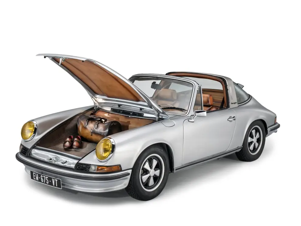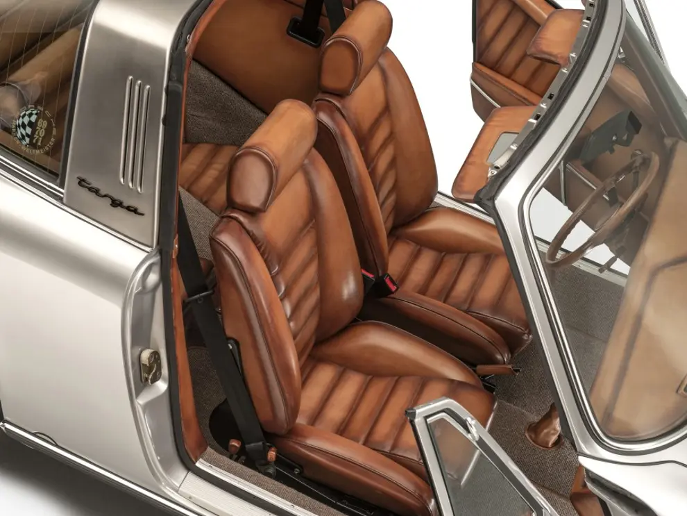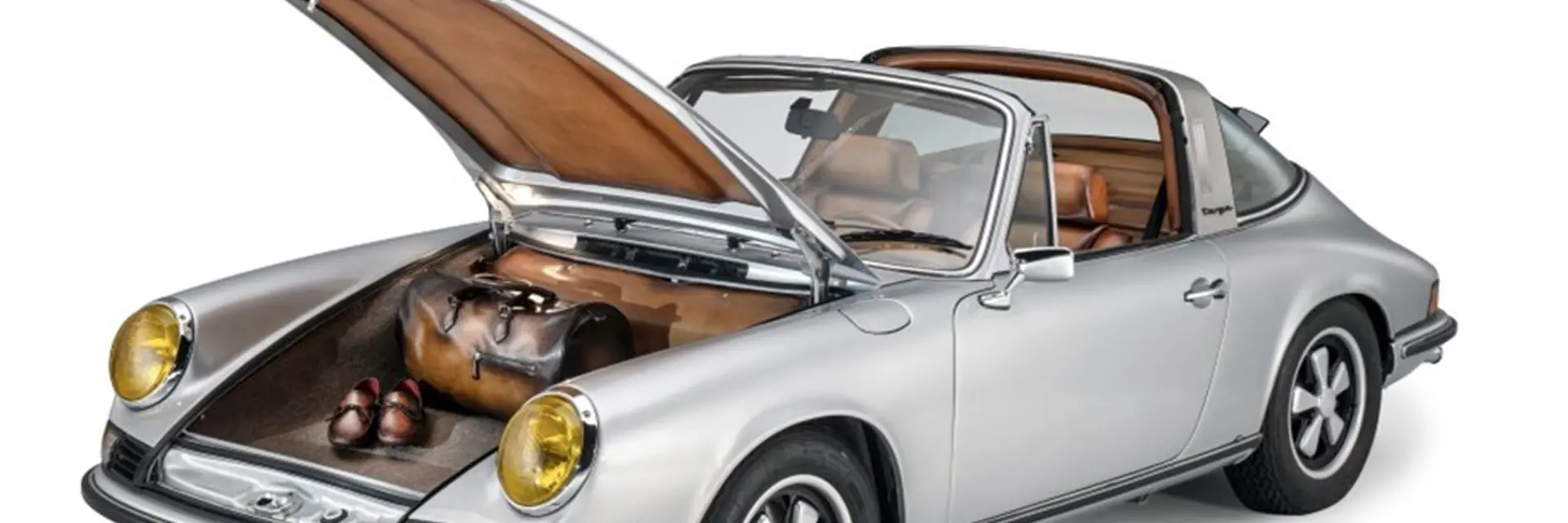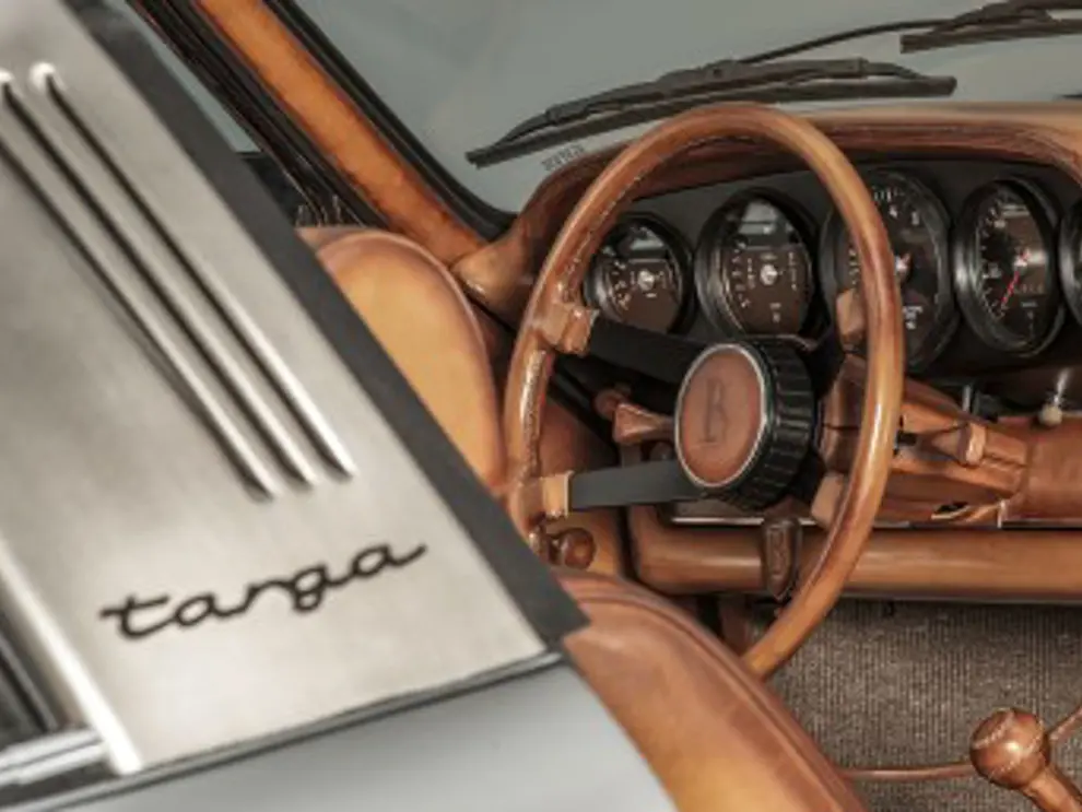For over 120 years, Berluti has been lauded for their exquisite bespoke footwear and exemplary standard of quality. In keeping with the same uncompromising standard of quality, the Berluti house developed their signature treatment of exclusive Venezia leathers. Their expert colorists hand craft unique patinas for each item, a technique which lends a distinctive distressed appearance. Similarly, Porsche has been praised for creating legendary sports cars as evocative as they are aesthetically beautiful. The unmistakable shape of a 911 has endured for 55 years, with clean and understated body lines and minimalist interior, but no compromises in the performance department has led to the 911 becoming one of the most beloved sports cars of all time. In 2005, the French fashion house expanded their line to include a full line of leather goods, and by 2012 had explored lifestyle offerings with unexpected collaborations. One of which is the first and only car customized by Berluti: the already highly coveted 1973 Porsche 911 S Targa- the last production year of the long hood, narrow bumper F-series 911- with an interior crafted at the hands of a master upholsterer under the careful guidance of Berluti.