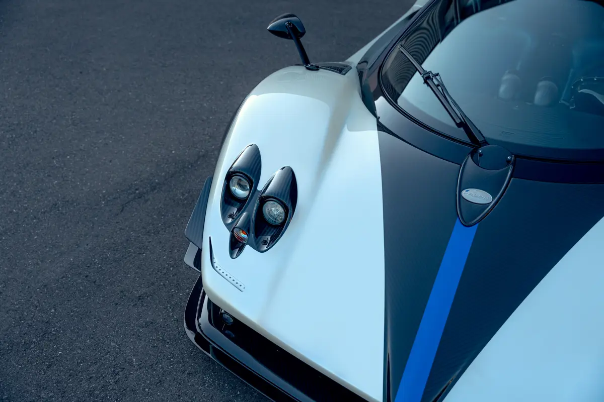 I was out with development driver Davide Testi, experiencing the Huayra, when I got to drive Mr. Pagani’s Zonda for context. Open the door, climb over the sill and you settle into the low-slung carbon fibre sports seats. The cabin of Pagani’s own car was a little careworn—an R&D testbed for fit and finish, it’d racked up 45,000 miles when it sold a few years later—but visibility through the generous glazing and low scuttle was astonishing. You sit there at the tip of the arrow, the V-12 payload fanning out behind you, anticipation sky-high as the shrill starter twirls, bringing a little fanfare before the twelve-banger fires.
