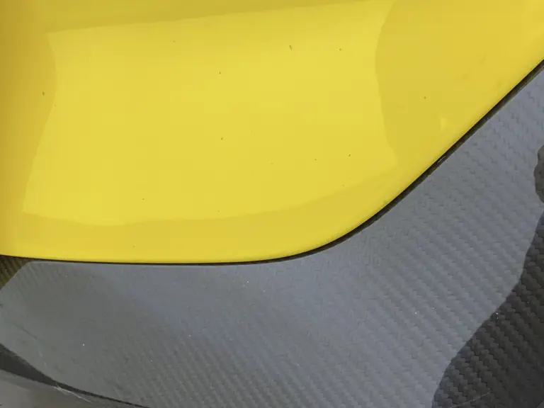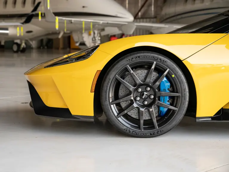 This 2017 Ford GT is finished in vivid Triple Yellow with Lightning Blue racing stripes, accented beautifully by the exterior gloss carbon fiber. The GT sports 20-inch gloss carbon fiber wheels wrapped with Michelin Pilot Sport Cup 2 tires. They are held on by optional titanium lug nuts and brought to a stop by matching blue-painted brake calipers. The GT’s interior is trimmed in black Alcantara with matte carbon accents. It features an F1-inspired steering wheel, fixed carbon-fiber Sparco seats, and a 6.5-inch infotainment system powered by Sync 3. The car currently displays just 1,471 miles from new.