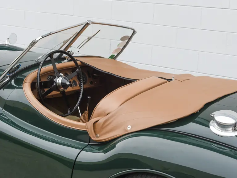 Built in 1950 to left-hand drive specifications, this XK 120 roadster is finished in the classically British color combination of Green with a tan interior and is one of 1,025 OTS (open two-seater) roadsters produced that year. Although nothing is known about its early history, it is assumed that the car was built for the U.S. market, due to its LHD configuration and speedometer in miles rather than kilometers. Presently registered in Italy, the car has been restored with vintage racing in mind and has competed in the 2010 and 2011 Mille Miglia. Used very much as its manufacturers intended, the car shows some signs of wear throughout due to its use and is said to drive well. It is important to note that while the engine’s head is unstamped, it is of the correct type.