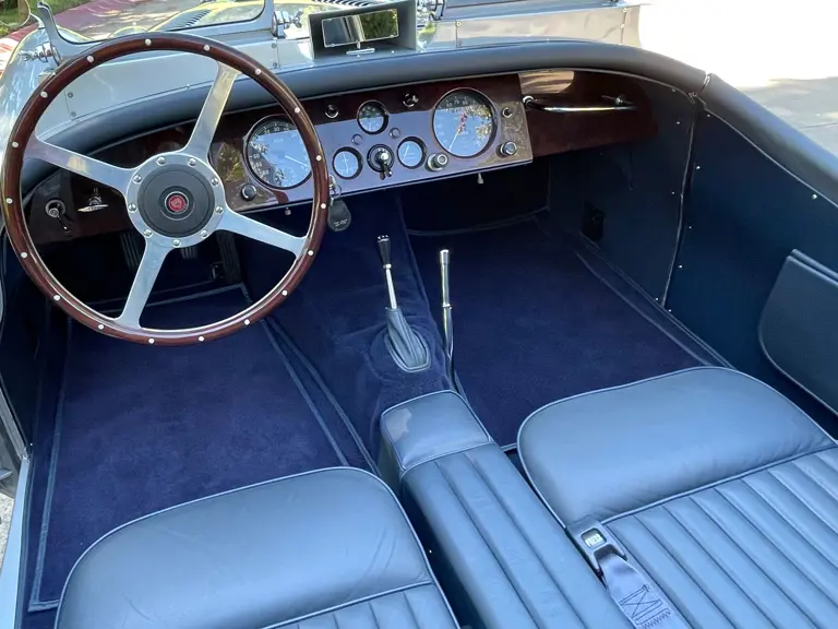 The XK 120 offered here retains its numbers-matching body and was refurbished under previous ownership by Imports Unlimited of Highland Park. At the time of the refurbishment some years ago, the bodywork was tastefully modified to include competition-style features like those Jaguar offered in period from the factory on SE models. These include dual Brooklands racing windscreens, hood louvers and strap, Marchal 662 driving lights, and an outside fuel-filler cap. A custom, driver-side rollbar, and augmented front and rear “quick jack” points were also installed at the time. Furthermore, the chassis and doors were lengthened four inches to increase interior space for driver and passenger.