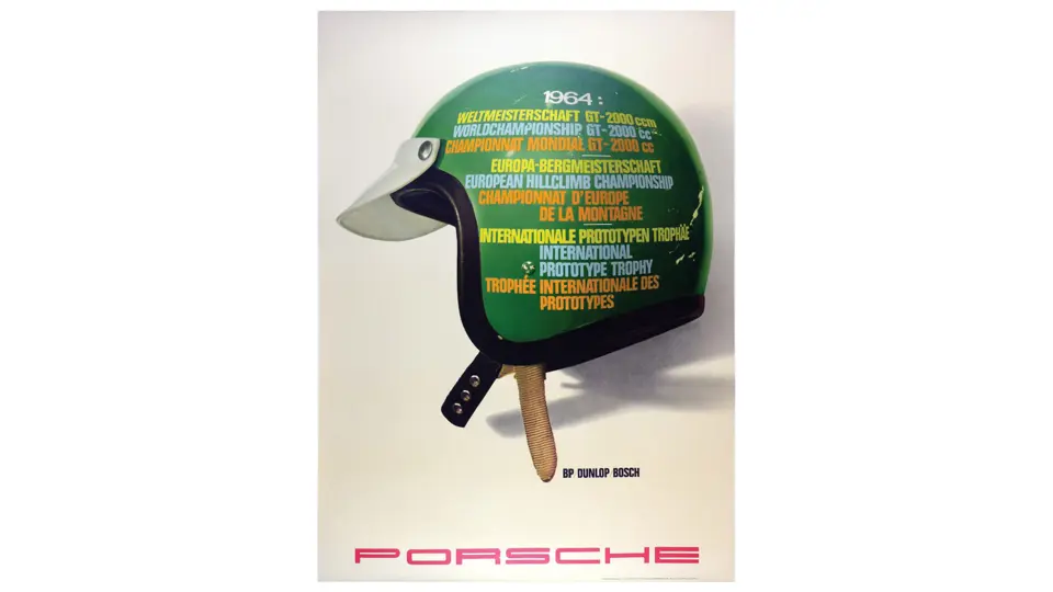 The famous commemorative 'helmet' poster for numerous 1964 championships. Porsche: Plakate, Posters, Affiches, Lewandowski, pg. 72 and Porsche: Die Rennplakate, Lewandowski, pg. 35.