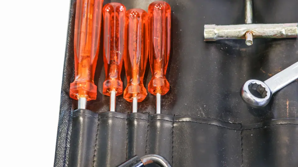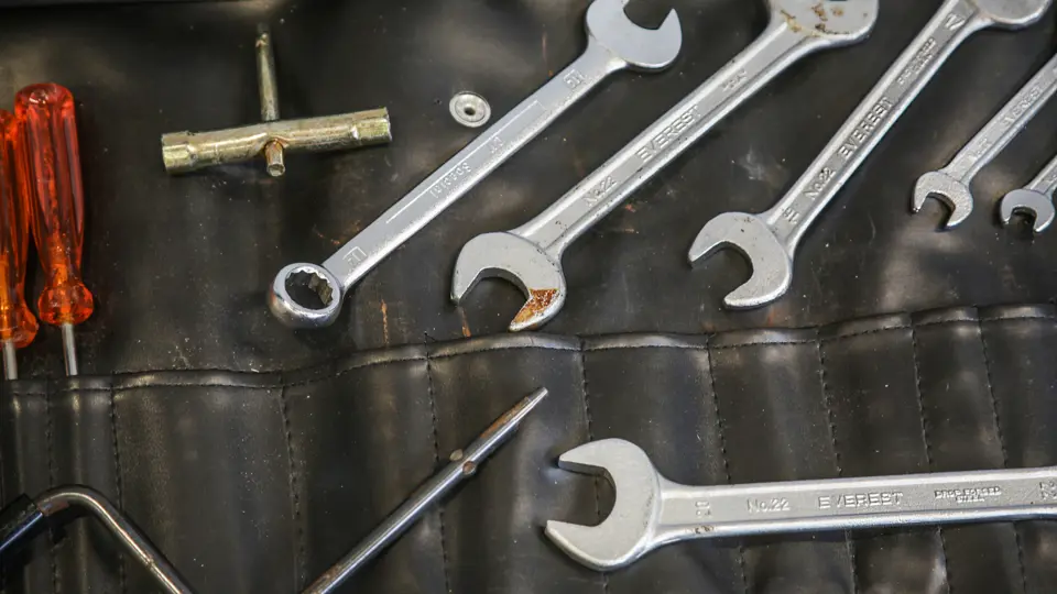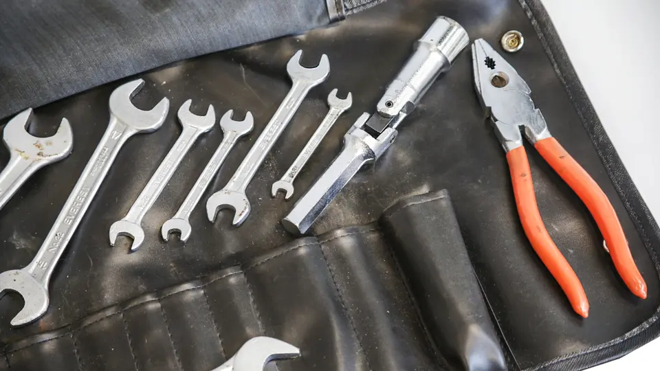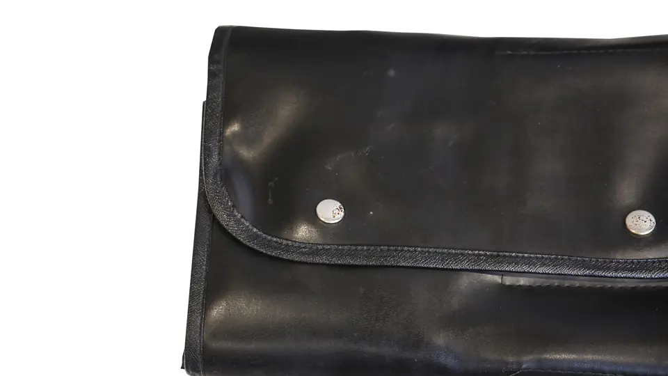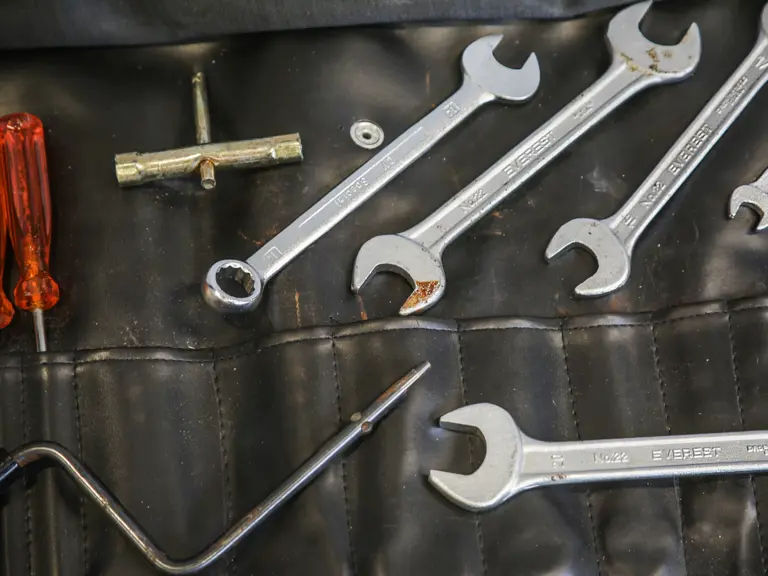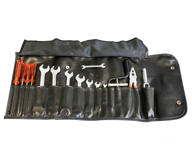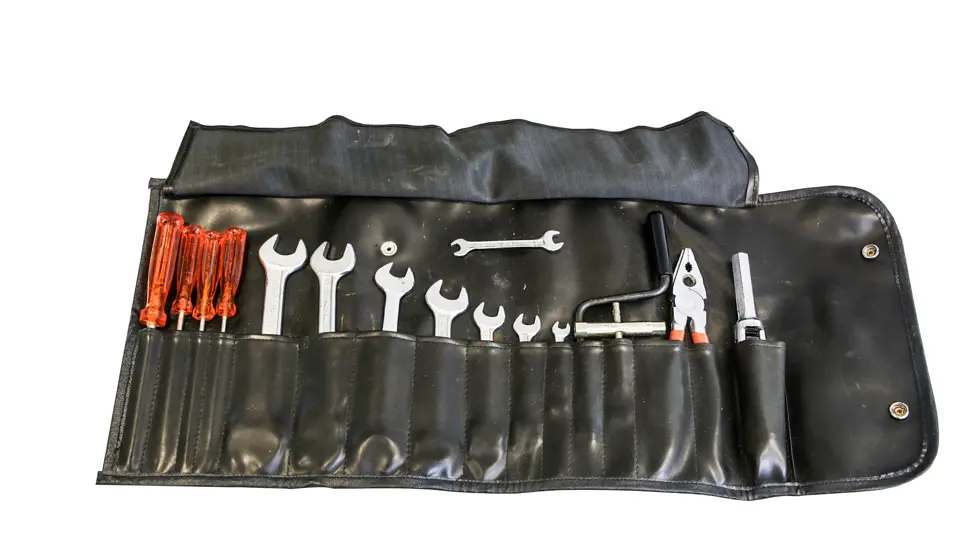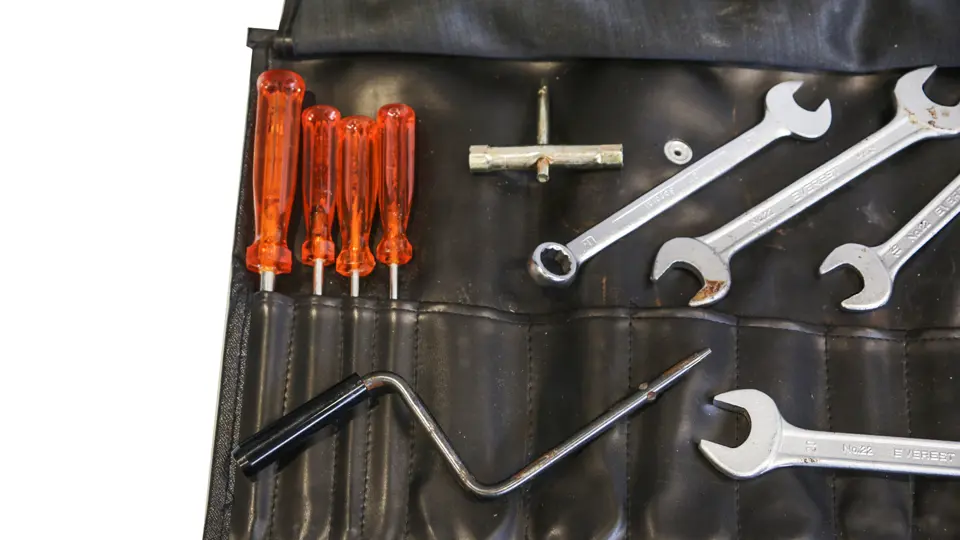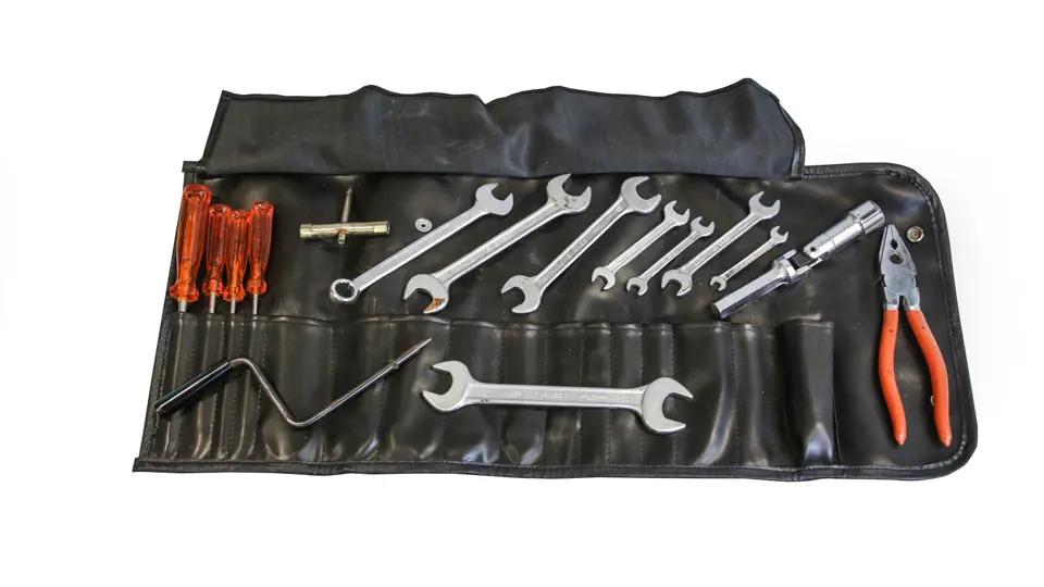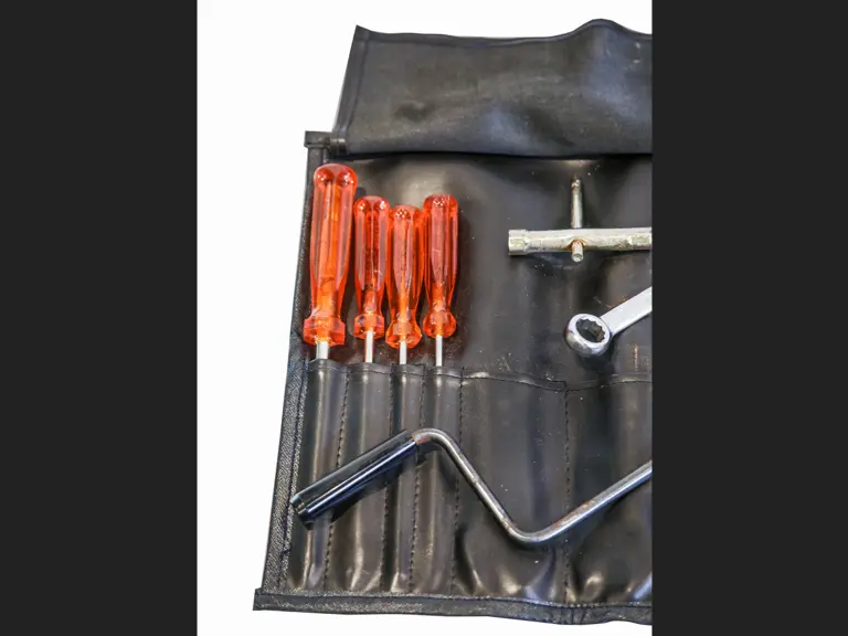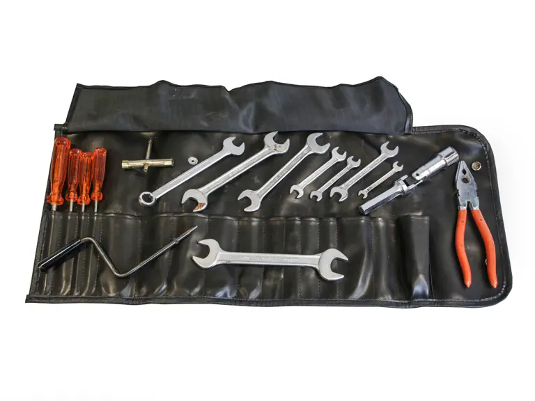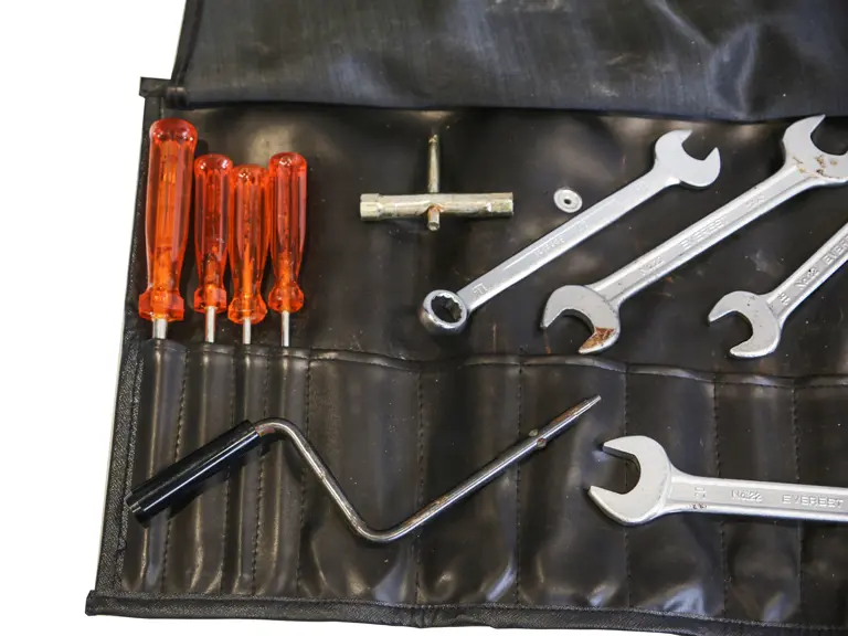 Offered here is a tool kit for a Ferrari 308 GTB or GTS. Included in the vinyl roll are four screw drivers, seven Everest no. 22 wrenches and a Polytools #14 wrench, a set of pliers, and other assorted tools.