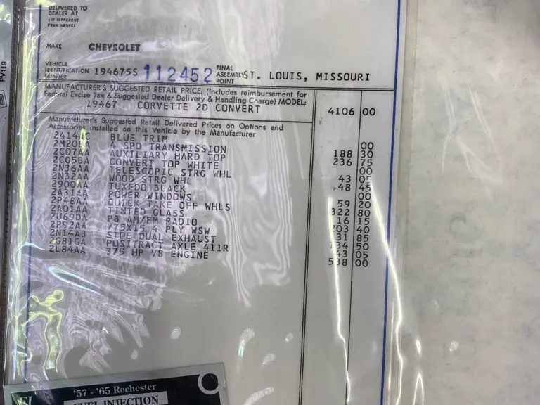 Fresh off winning a NCRS Top Flight award the year prior, this Corvette was acquired by Terry in 2004 and has since been held in a climate-controlled garage and rarely exhibited at events over the past 16 years. The earlier frame-off restoration was reportedly completed sometime in the late 1990s by noted workshop D & A Corvette Restorations of Gillespie, Illinois. Additionally, accompanying paperwork confirms that the fuel injection system was entirely overhauled contemporaneously by noted Corvette fuel-injector specialist John DeGregory of Greensburg, Pennsylvania. Further inspection of all visible Rochester-branded injection components attest to their proper sequence numbers.