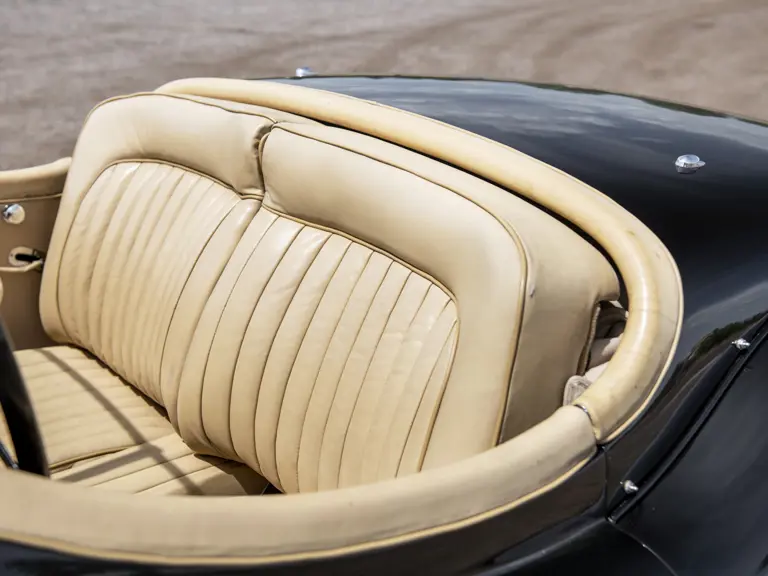 The car’s rear wheels are hidden behind a set of removable fender spats, while a chrome set of correct fender-mounted mirrors are perched forward of the low-slung two-piece V-windscreen—key styling features that give this Jaguar an air of timeless elegance. Standard drum brakes are housed behind a set of distinctive and appropriate black-painted disc wheels, and the passenger-side dashboard is adorned with a Jaguar speed record plaque commemorating the 132.6-mph high-speed run driver Ron Sutton achieved in a largely stock XK 120 in Belgium on May 30, 1949.