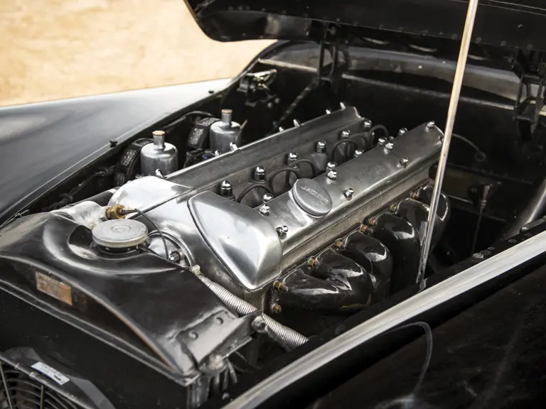 This 1950 XK 120 is believed to be the 291st of just 1,025 OTS (open two-seater) roadsters produced that year. Today the car is finished in black paint over biscuit leather. The currently equipped aluminum cylinder head is believed to be a replacement and stamped to match. With the intent of making this car a highly enjoyable driver for both daily use and event purposes, the current owner installed a modern Tremec five-speed manual transmission. An original-type four-speed gearbox and driveshaft removed from the car are both included in the sale, giving one the option to return to period specification if desired.