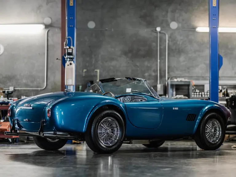 The Cobra’s tubular frame supports robust mechanical components, the most impressive of which is a balanced and blueprinted 331 cu. in. aluminum 289 V-8 engine built to exact standards by the Shelby Engine Company, dyno-tested at 450 hp with 415 ft. lbs. of torque. A five-speed manual transmission, Shelby aluminum housing differential, dual piston four-wheel disc brakes and Spicer split-spline half-shafts are also included. The cockpit features tinted windscreen visors, leather-covered dash and map pockets. The front grille is instantly recognizable, and the car looks ready for action with front and rear bumpers, wind-wings and chrome 15-inch wire wheels. Finished strikingly in Guardsman Blue with black leather seats, this iconic and authentic Cobra is spectacular in every way. With only test-miles on the odometer, this spectacular Cobra is virtually a new car, presenting a rare opportunity to acquire one of the best of the best ‘8000 Series’ Cobras there is.