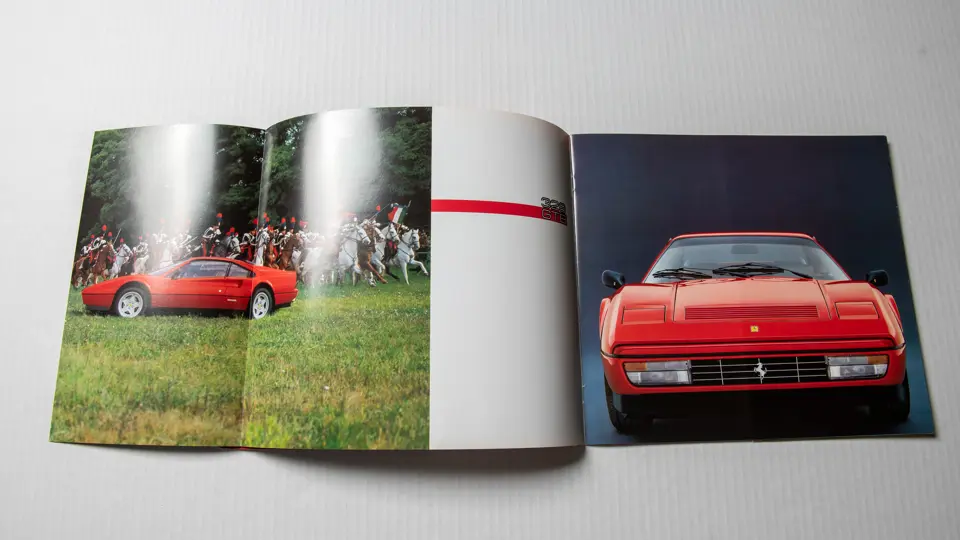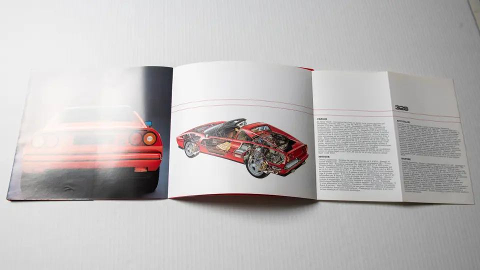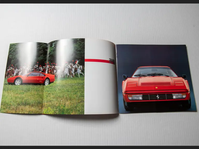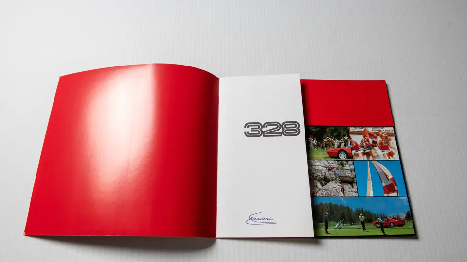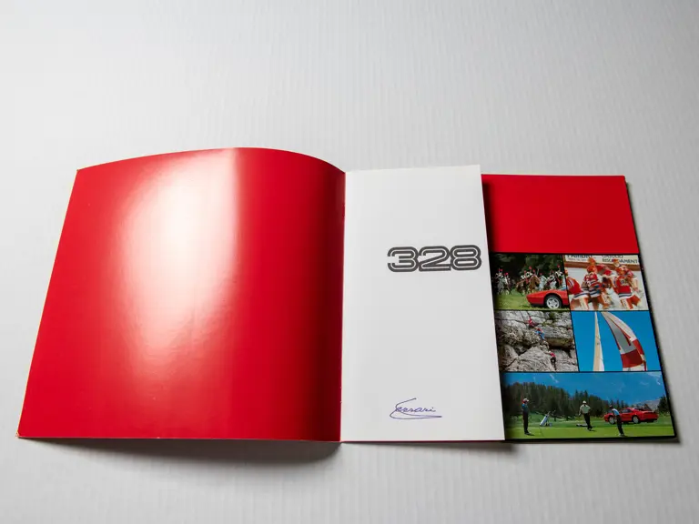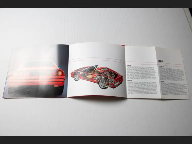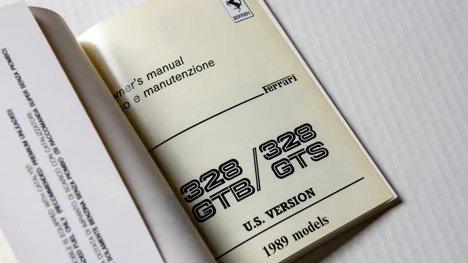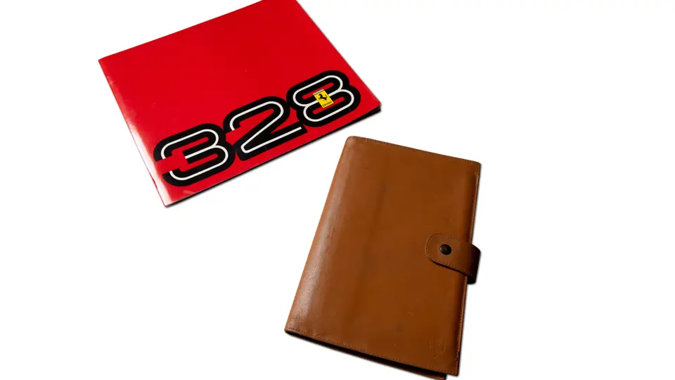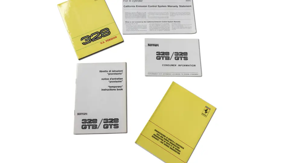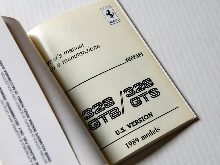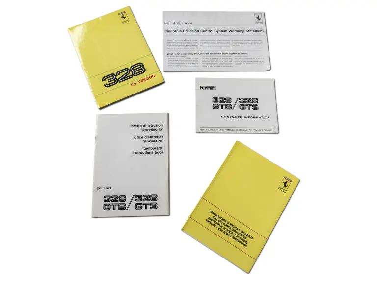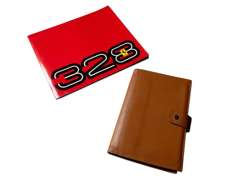 Includes 1989 model year US version owner's manual (no. 535/88), "temporary" instructions book (no. 389/85), sale and service directory (no. 560/6/89), consumer information booklet (no. 372/85), California emission statement (no. 566/89), and large format 328 brochure (no. 394/85). Leather folio is in very good original condition.
