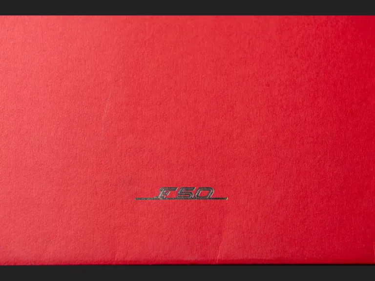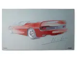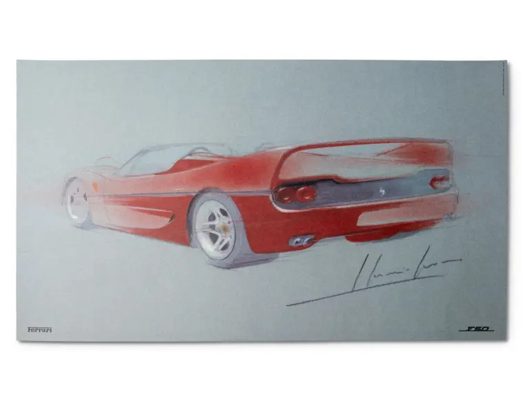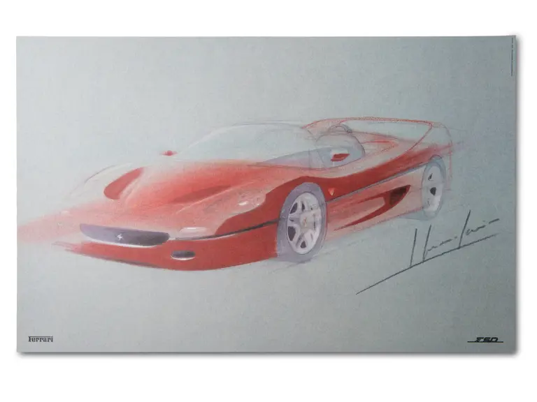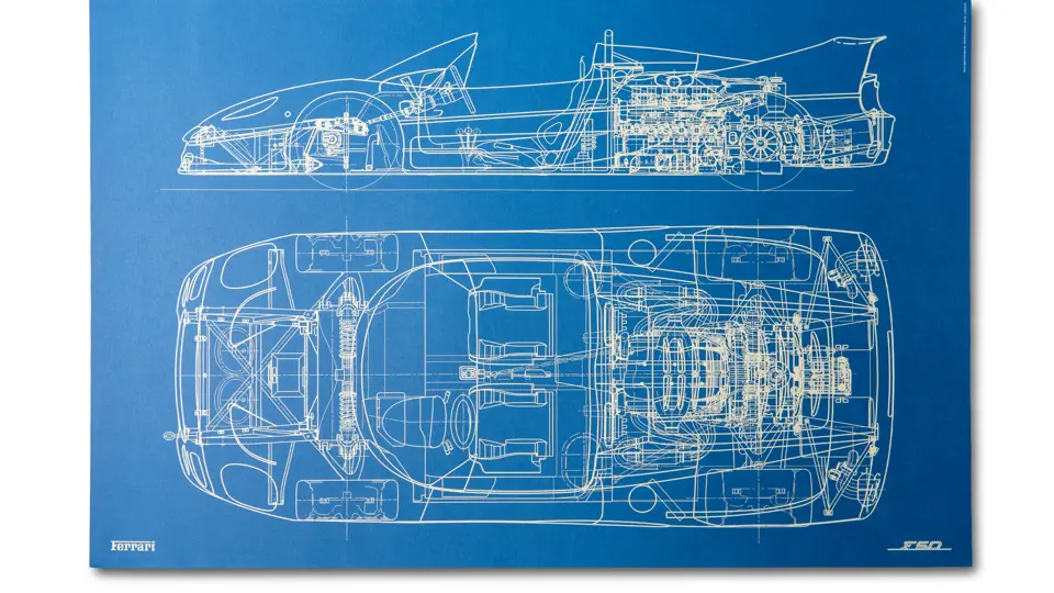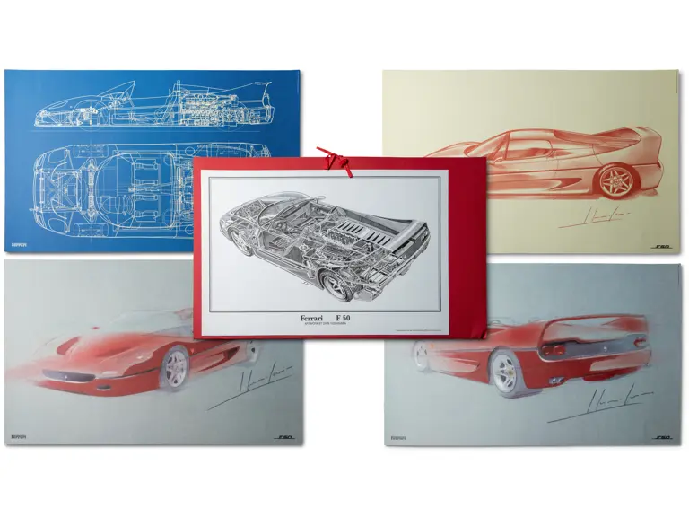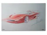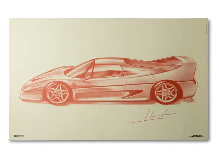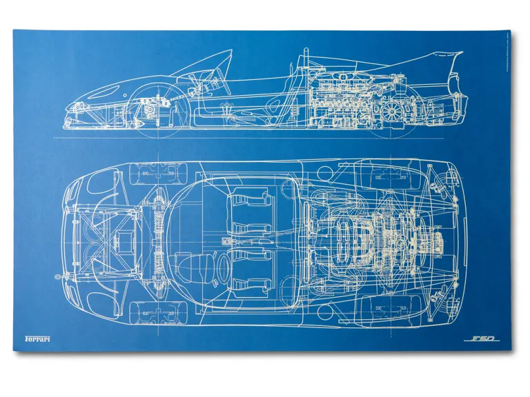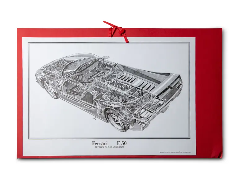 Features three design sketches and a blueprint view of the F50. Also includes a cutaway drawing by Shin Yoshikawa, 1997, 18 × 24 in.