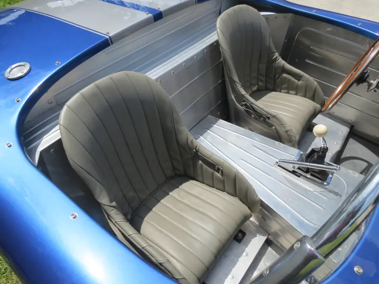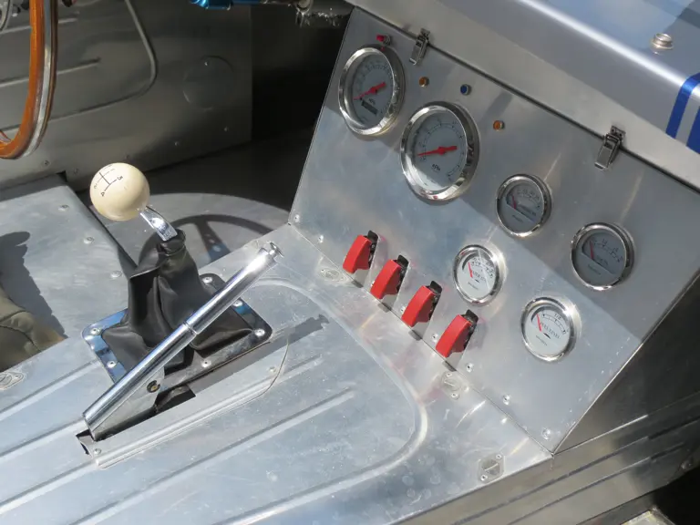 Exterior features include 15-inch kidney-bean wheels, custom egg-crate front grille, and louver panels. The interior is equipped with upholstered aluminum bucket seats, center-mounted gauges, and a wood-rimmed steering wheel. The SR-100 was designed to accommodate the curved windshield assembly of a Chevrolet C1 Corvette. The windshield on this example is an original C1 unit, according to the consignor. The car was resprayed to its current livery of blue with silver racing stripes by Mark Nordin of Nordin Enterprises Inc. in Oak Grove, Minnesota. The previous finish was maroon with gold fogging.