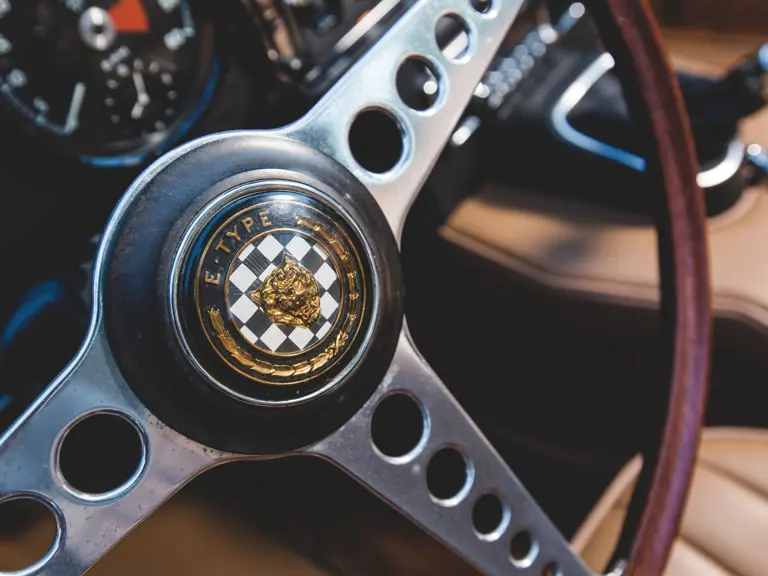 Today the E-Type presents nicely, having benefitted from extensive refurbishment under previous ownership. Work reportedly included replacing the body tub sheet metal, with the exception of the bulkheads and the bonnet section, boot lid, and inner door panels. Upon completion of the metalwork, the body was painted in Silver Blue with a cinnamon leather interior and tan top. The interior is nicely appointed with a wood-rimmed steering wheel and an upgraded modern radio unit.