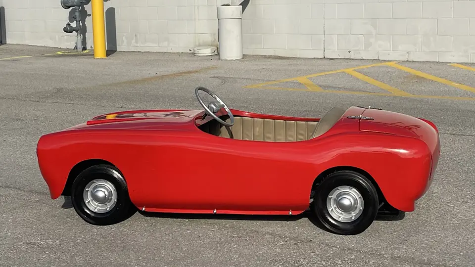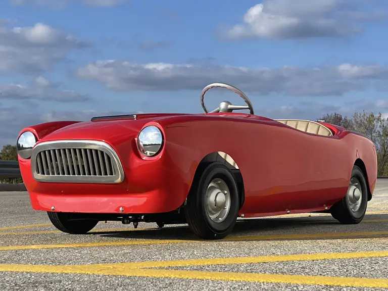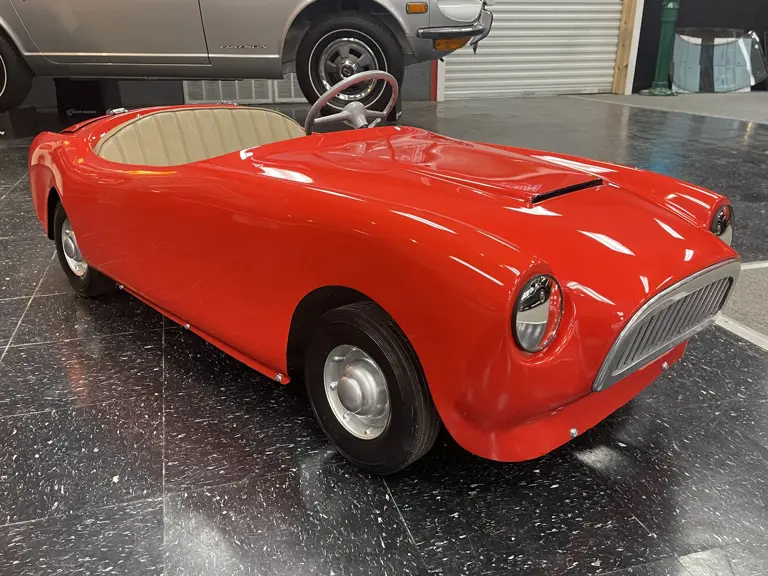 This 1950s era go-kart is of unknown construction but is reminiscent of a Bimbo racer. Its appearance harkens back to many of of the great sports cars of the 1950s, featuring design cues similar to the AC Ace, Ferrari 166 MM, and Siata 208S, though seemingly not a direct copy of any specific model. It features a fiberglass body, gas engine, and tan upholstery. It has recently been restored to a period correct appearance and would make a wonderful gift for a budding sports car enthusiast or go-kart racer.