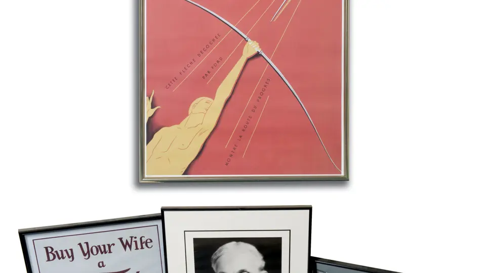 Lot includes an assortment of vintage Ford posters including an attractive example depicting an archer launching the V8 emblem, a period photo of a Ford showroom, and a period image of Henry Ford.