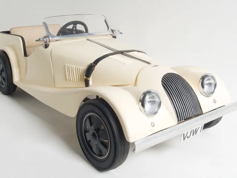 48x15x19 inches. Presented here is a unique Morgan roadster pedal car produced by Hamilton Brooks Cars of England. A highly detailed example, it features a fibreglass body, leather seat, removable hood secured with hoodstrap, and working headlights.