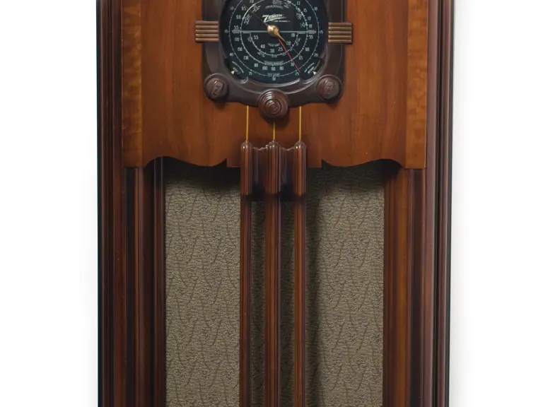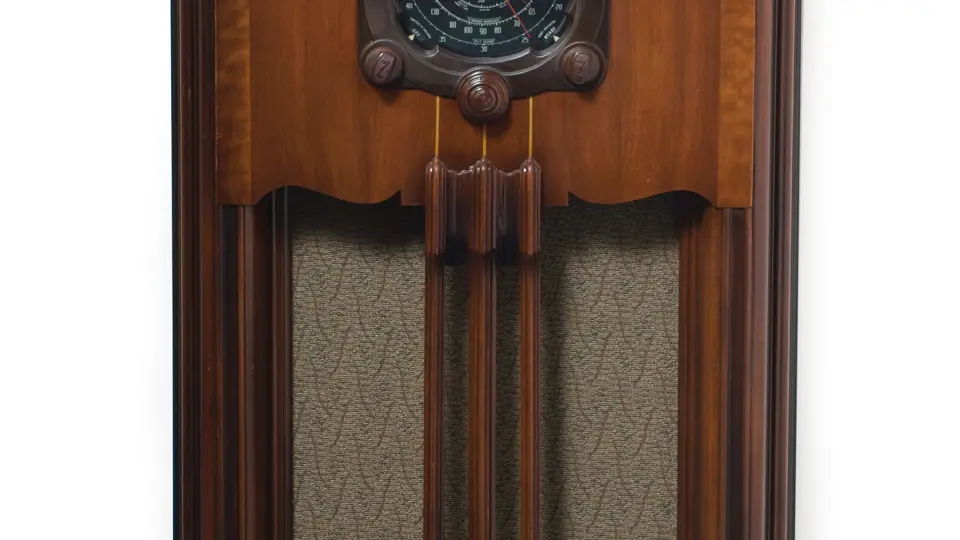23.5x40x13.5 inches. �Stars and Stripes�, black face, original finish, restored chassis.