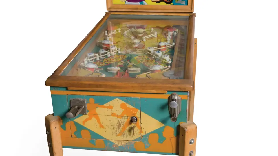 26.5x68.5x55 inches. A 1950s-era pinball game with a boxing theme, this example features a colorful, detailed playing surface. This pinball machine is all original and shows minor scratching and areas of wear.