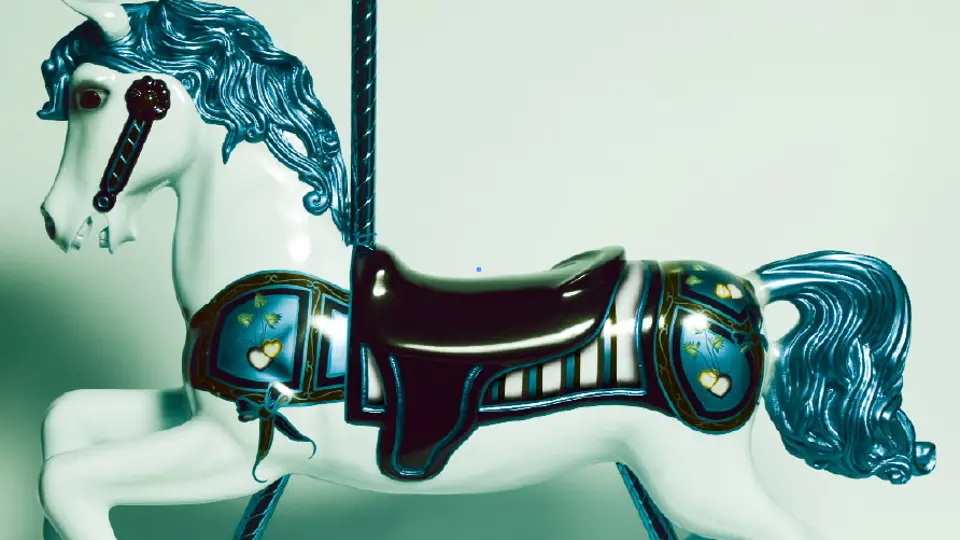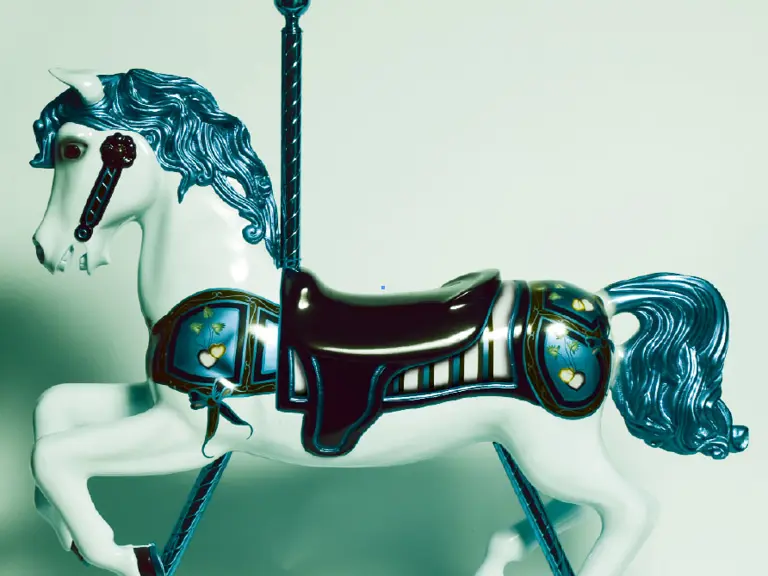 47x43x17 inches. This beautifully finished modern rocking horse features hand painted details and is in excellent condition.