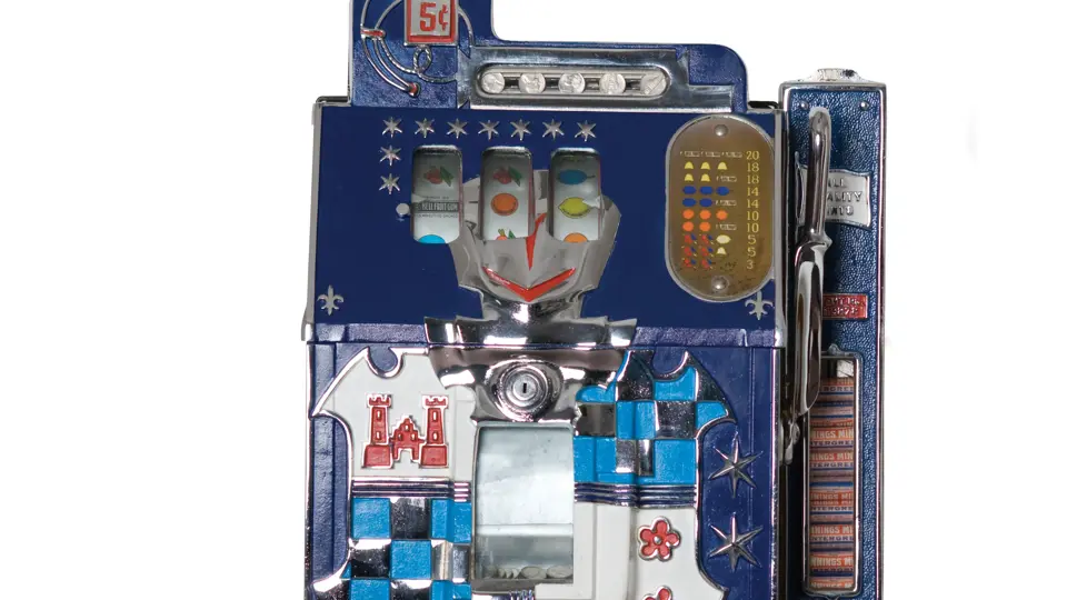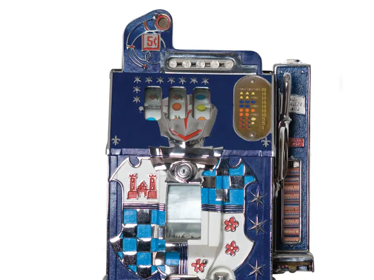 19.5x26x15 inches. The Mills Castle Front slot machine was introduced in 1933 and was the most popular slot machine of the prewar era. This example, from 1936, has undergone some cosmetic restoration also features a side-mounted mint dispenser. Comes complete with a wood display base.