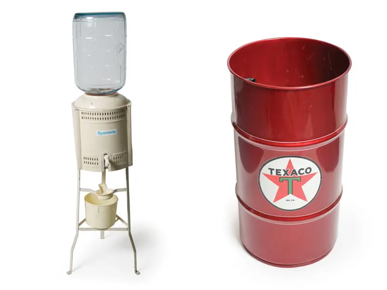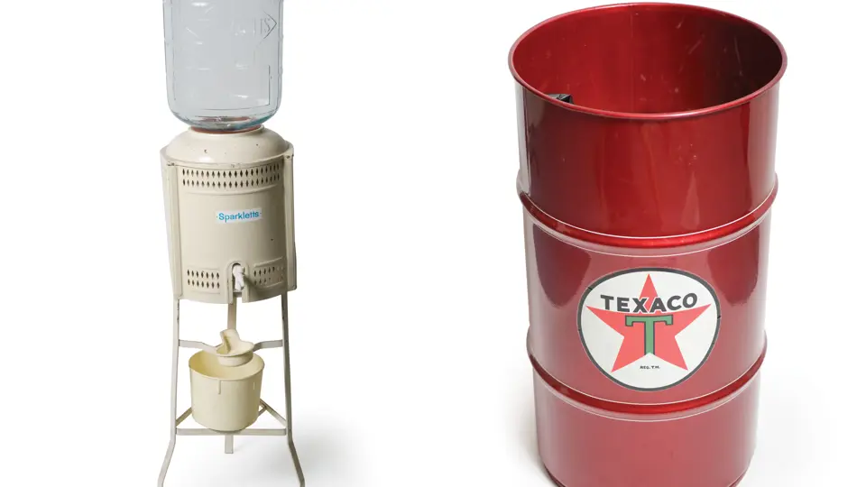 Lot includes an open top trash can finished in Texaco colors and graphics and a vintage water cooler, complete with original glass jug. Minor scratching and paint loss visible on close inspection.