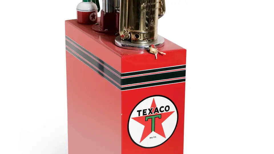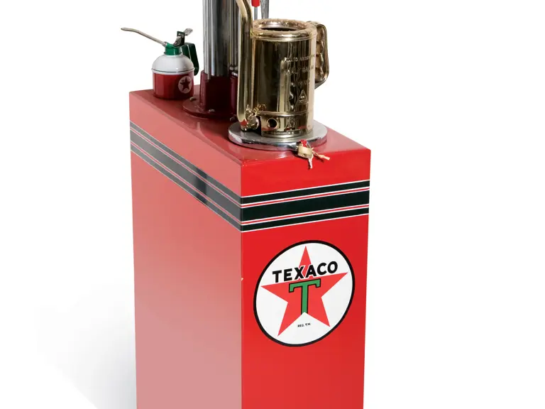 23x53.5x10.5 inches. This attractive lubester has been restored in traditional Texaco colors and trim. A very presentable example, it comes with a Texaco oil bottle and half gallon oil can.