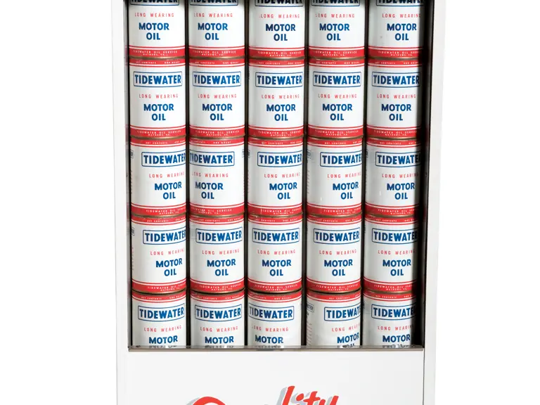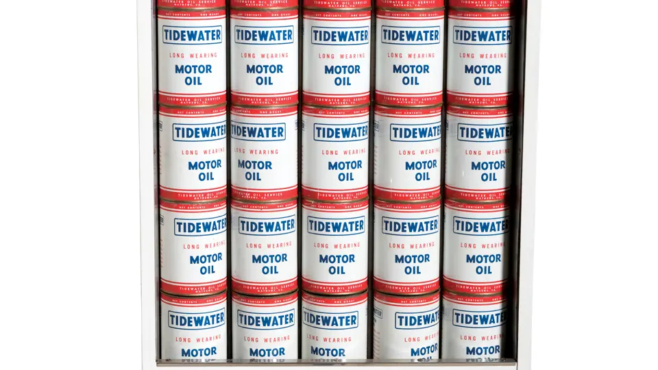 This attractive original oil rack has been restored and comes with a complete display of reproduction Tidewater Motor Oil cans. A very presentable example.