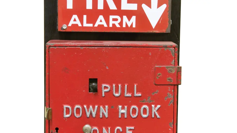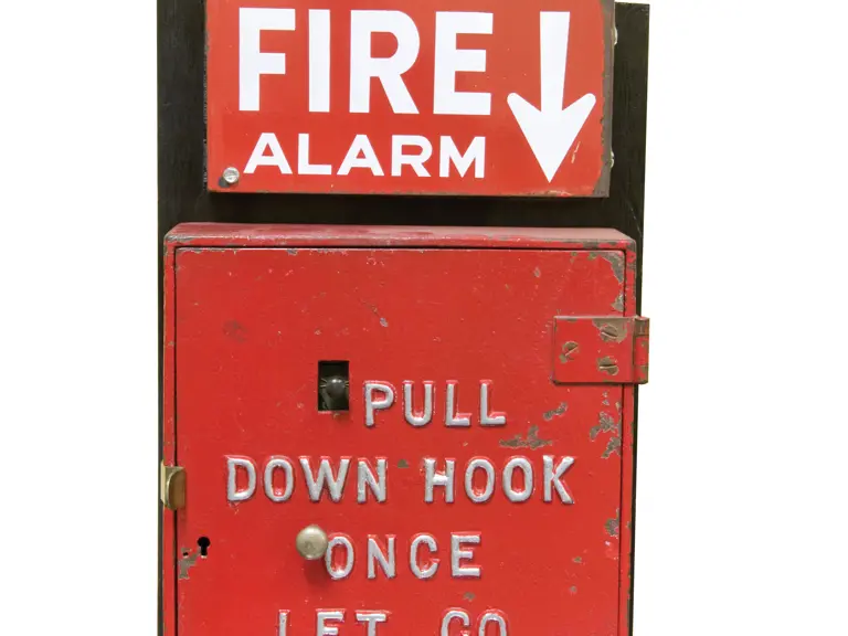 This fire alarm telegraph has been mounted on wood and has a Morse Code sender with a porcelain sign.