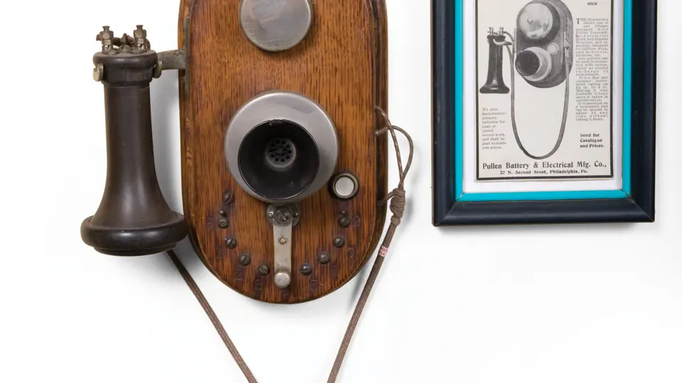 This turn of the century example features an oak nine-station cabinet and an outside terminal receiver.