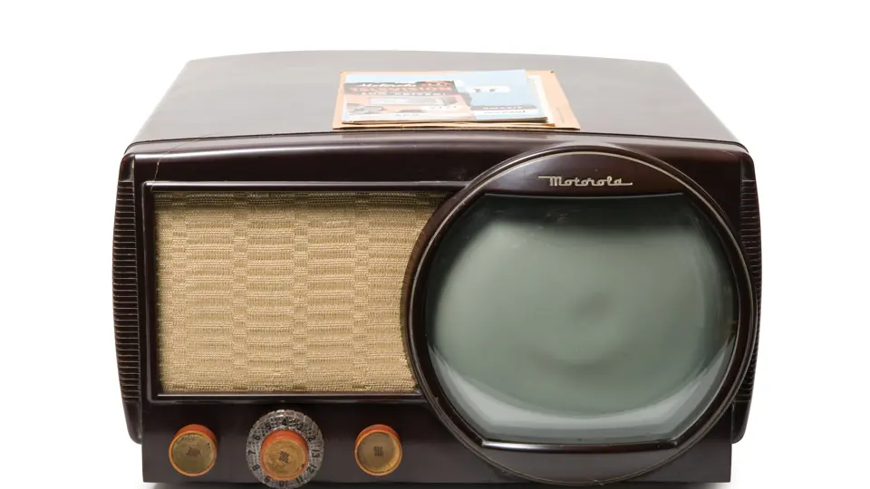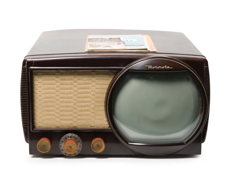 17x9.5x17 inches. This appealing model features an 8-inch round black and white screen housed in a Bakelite cabinet. Surface shows a few small cracks.