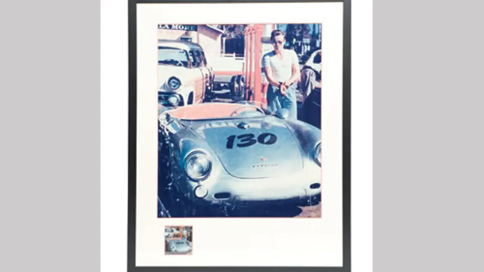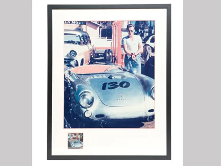 32x41 inches. Offered here is a beautifully framed enlarged poster of what has come to be known as James Dean�s last photograph, snapped by a fan just hours before his fatal crash. A small version of the photo is inset at bottom left. Excellent condition.