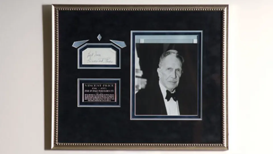 21x17 inches. Offered here is a card autographed by Vincent Price, noted American actor. It is attractively displayed in a double matted custom frame.