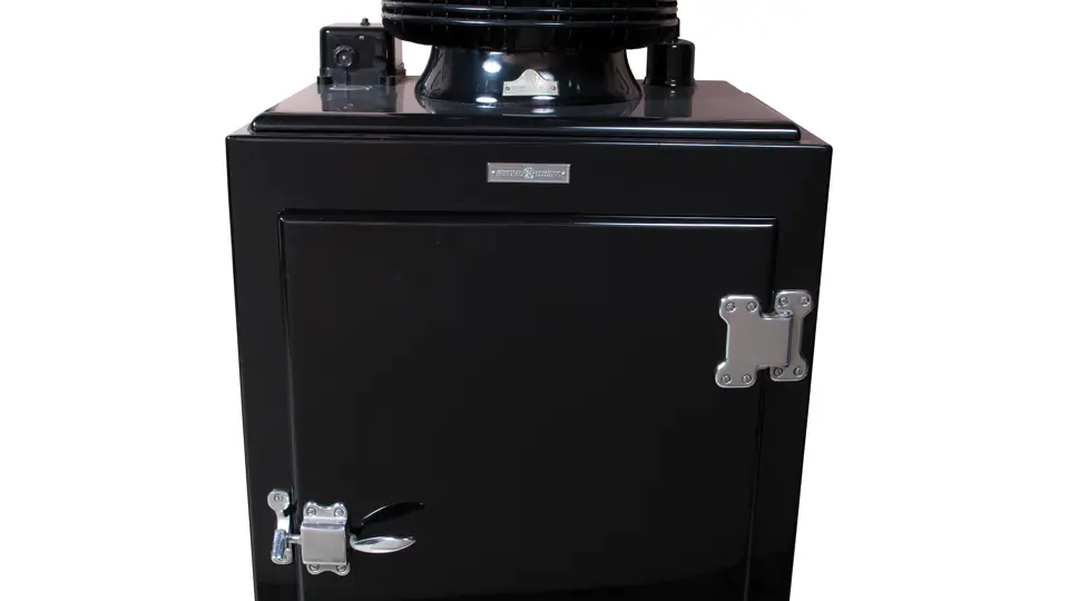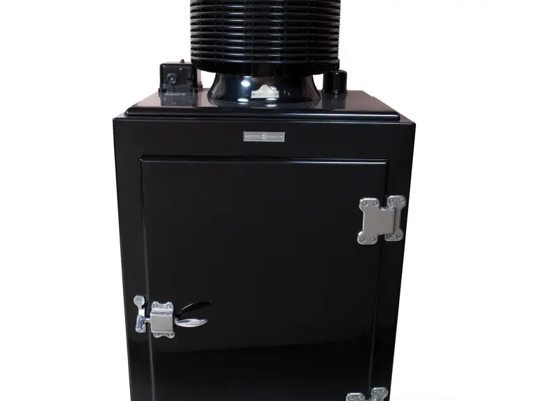 28.5x65x26 inches. A popular vintage model, the monitor top was introduced in 1927. This example has been finished in black and is in very presentable condition. Contains three interior shelves.