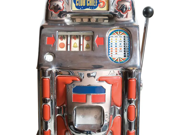 16x27x16.5 inches. This dynamic model from 1946 features a colorful front panel that illuminates when plugged in and shiny chrome. The example offered here is very presentable and would be an excellent addition to any period gaming collection. Comes complete with a wood display base.