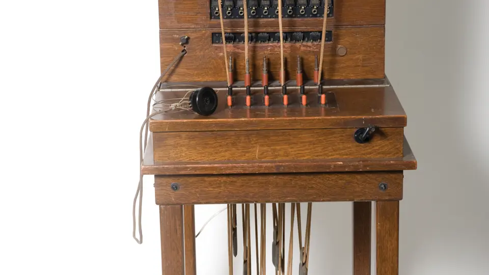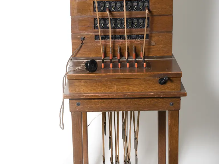 A hard to find example, this model has an oak Model 18 drop-type cabinet, a suspended transmitter and a magneto.