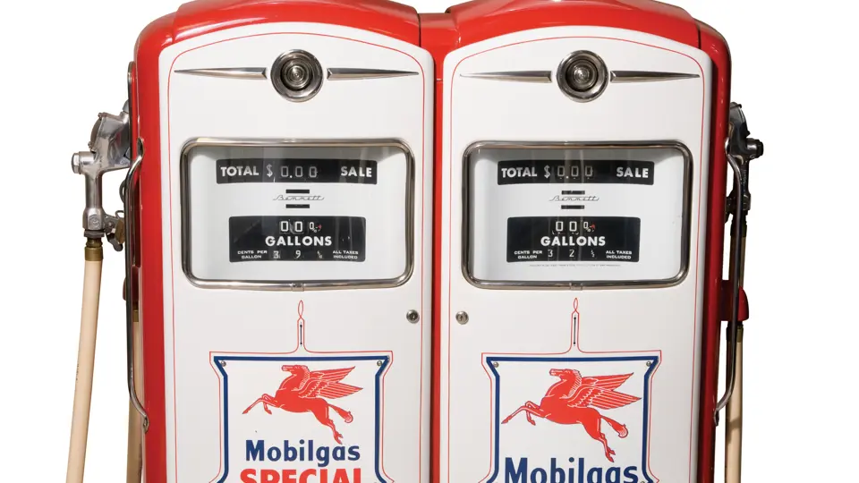 34x74x15 inches. This Bennett Twin 976 pump, built only from 1954 to 1956, has been handsomely restored in Mobilgas colors and trim. It features two reproduction globes and is in excellent condition.