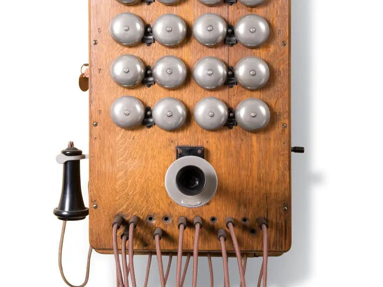 This example features an oak 20 bell wall-mounted cabinet and a magneto.