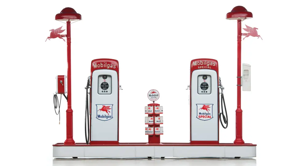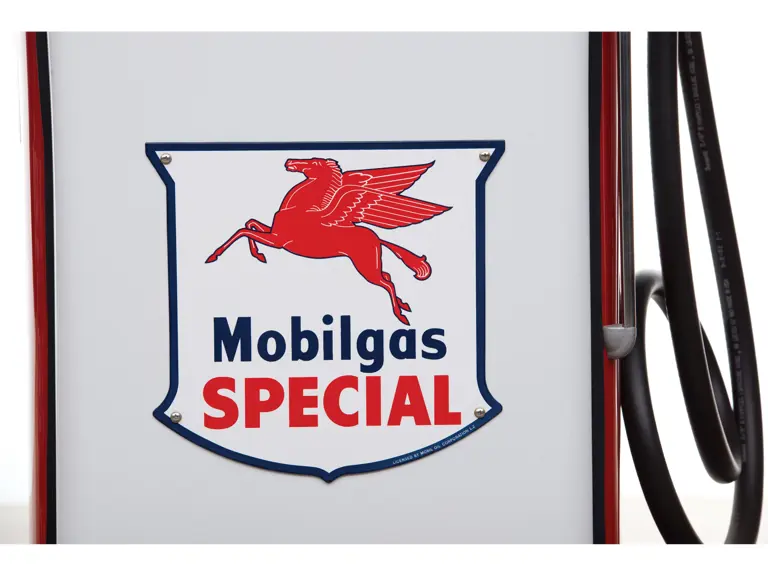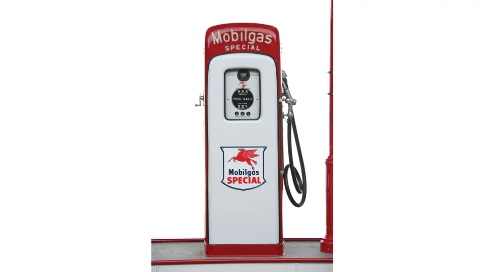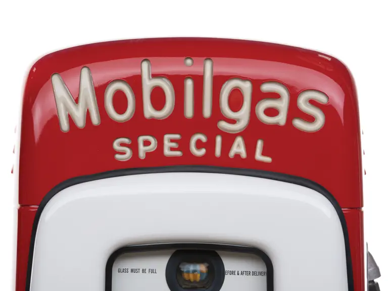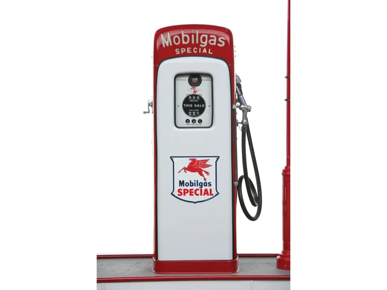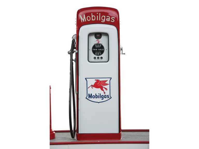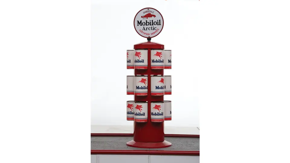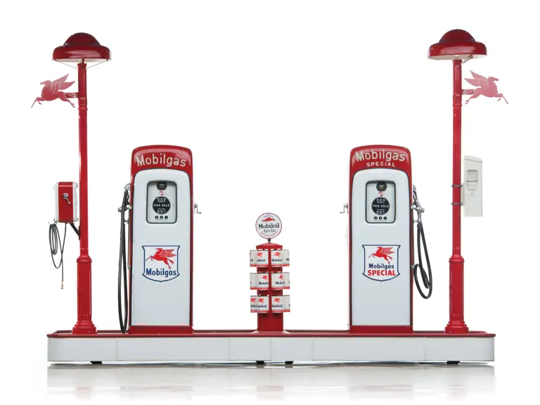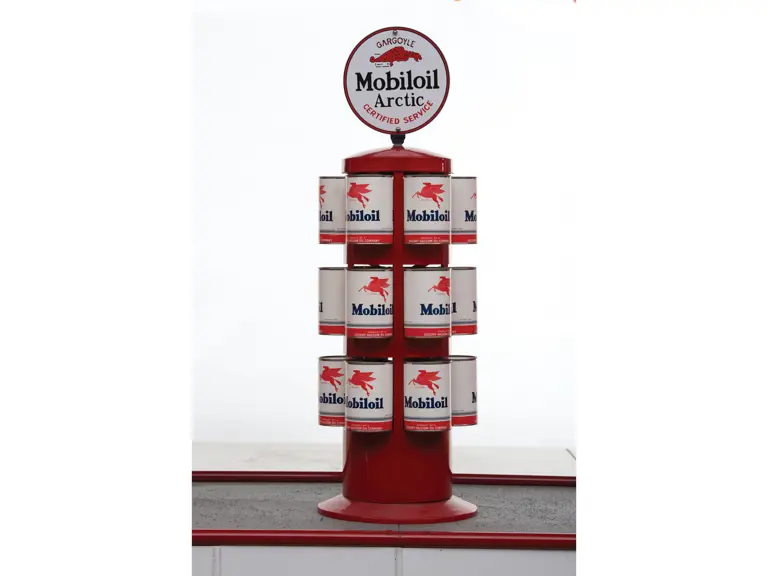 This recreation of a Mobil gas station island includes two professionally restored Martin & Schwartz Mobil script top gas pumps and two station lighters with hooded lamps, one of which features a Gil-Bar-Co air meter and the other a Mobil window washing station. Also included in the display is a Mobil oil rack, complete with empty oil cans. This wonderful display is in very presentable condition and would be the focal point in any collection of petroliana, as it convincingly replicates the ambiance of a period gas station.