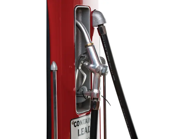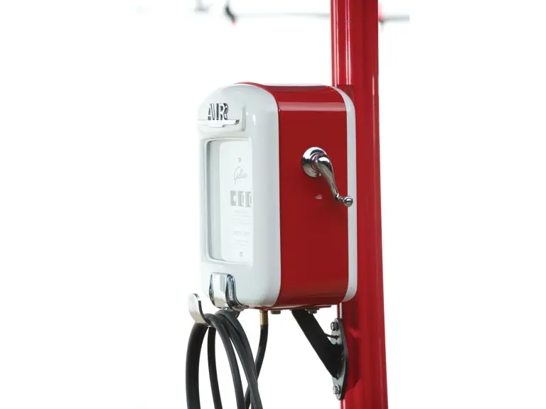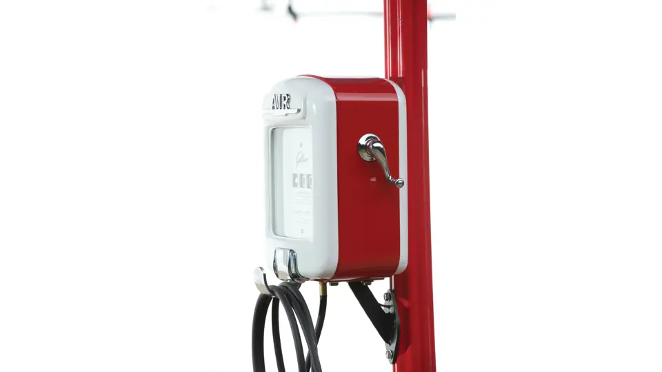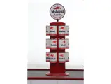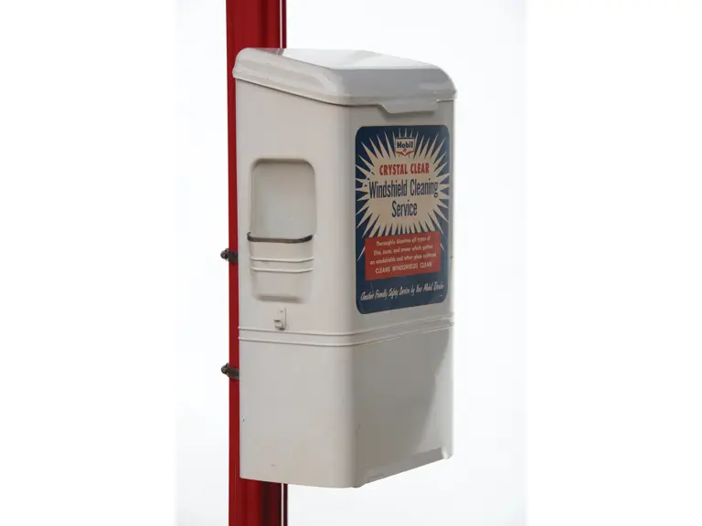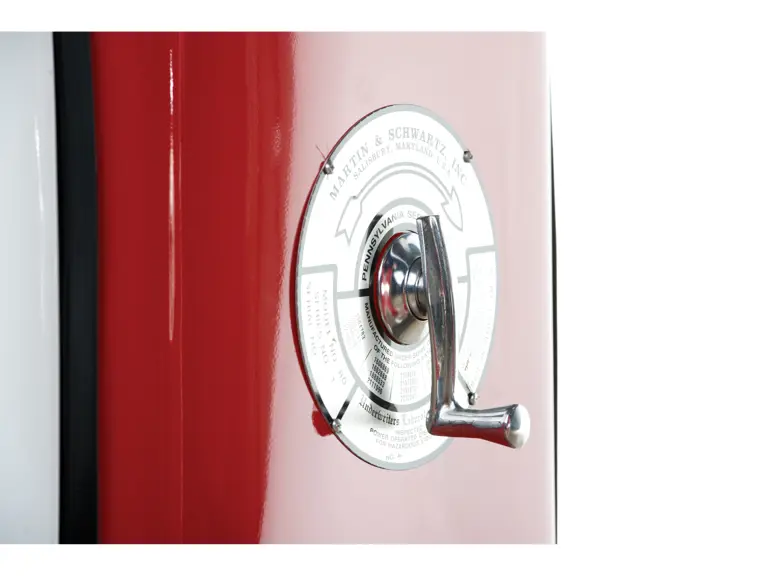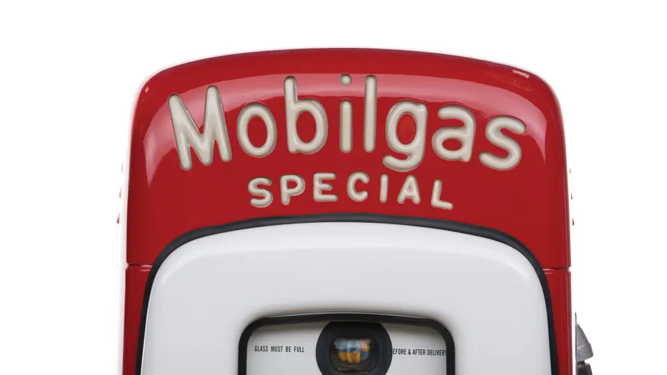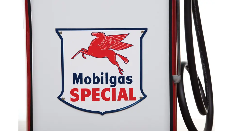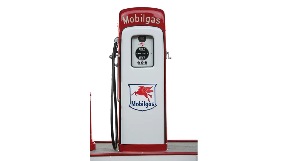 This recreation of a Mobil gas station island includes two professionally restored Martin & Schwartz Mobil script top gas pumps and two station lighters with hooded lamps, one of which features a Gil-Bar-Co air meter and the other a Mobil window washing station. Also included in the display is a Mobil oil rack, complete with empty oil cans. This wonderful display is in very presentable condition and would be the focal point in any collection of petroliana, as it convincingly replicates the ambiance of a period gas station.