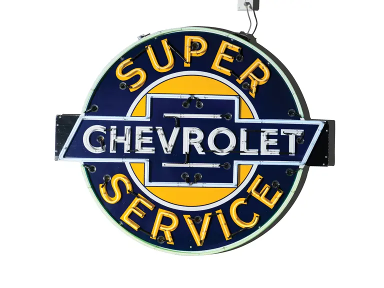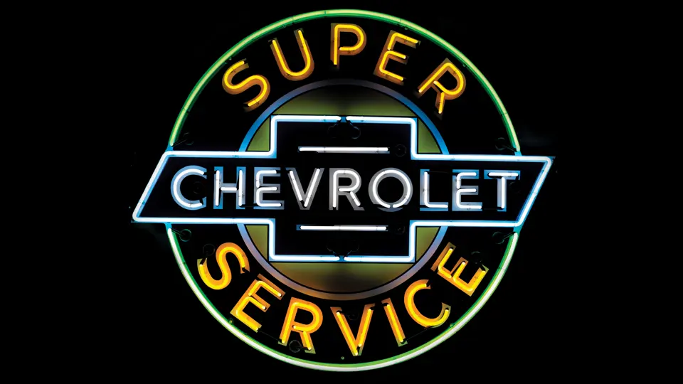 The classic Chevrolet crest glows in multicolor neon in this striking example. The porcelain surface shows a high-gloss finish that has no notable flaws.