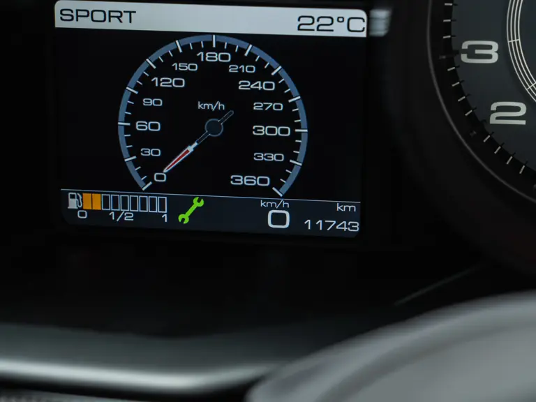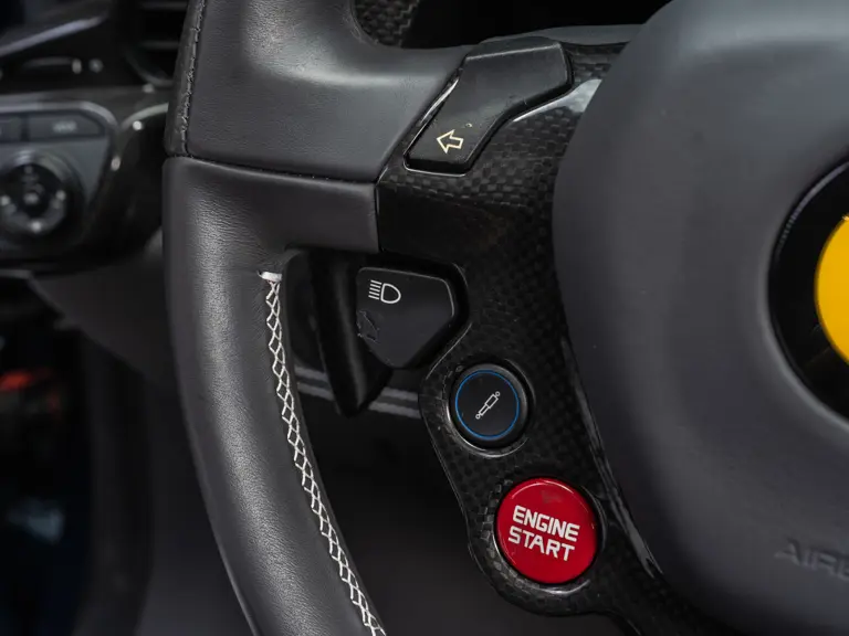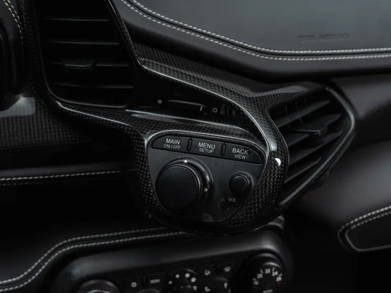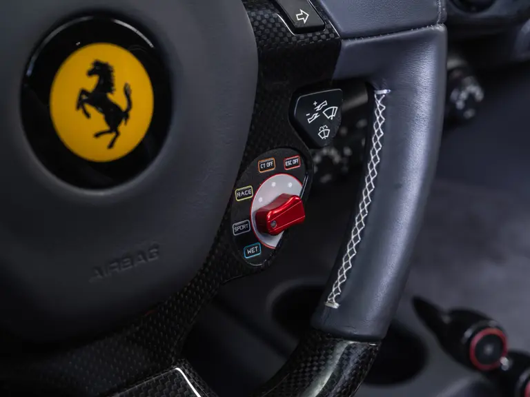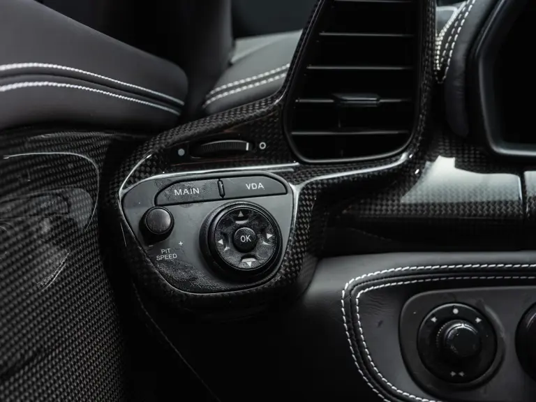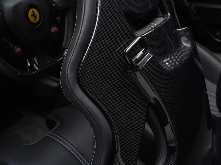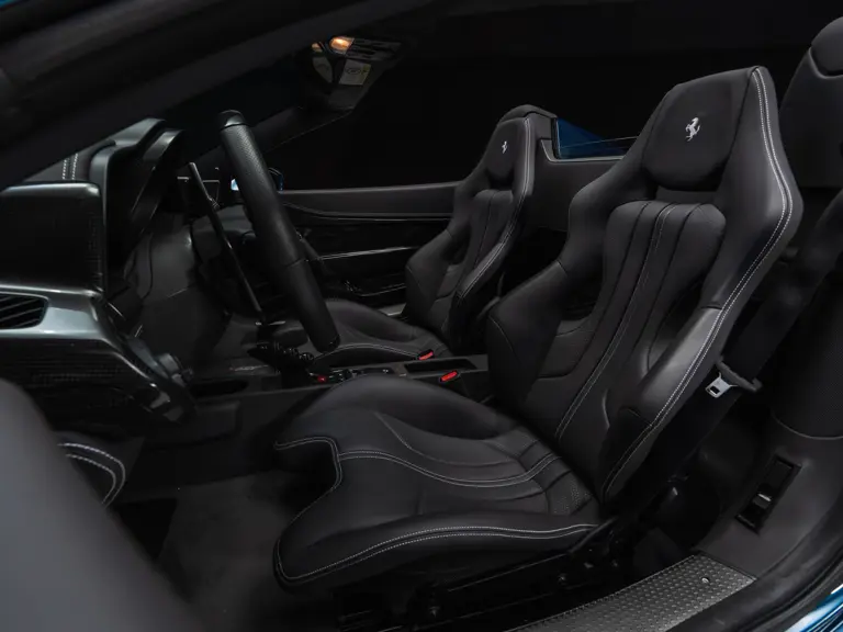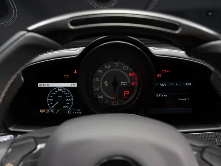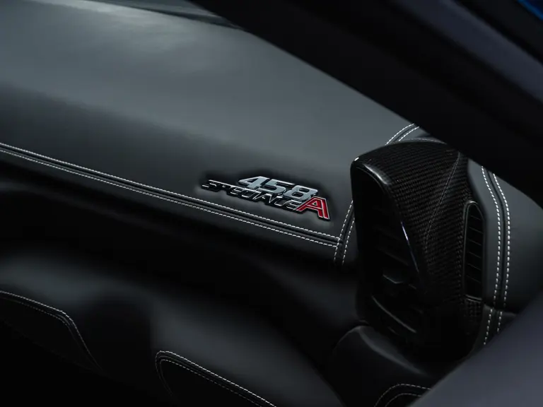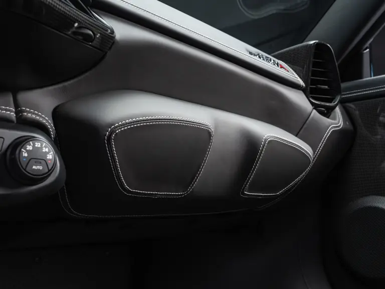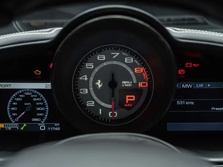 While the Speciale A marked a significant 90-kilogram weight saving over the 458 Spider, this car still boasts an exquisite, leather-lined interior. The carbon-style racing seats are trimmed in Charcoal hide and feature white Cavallinos stitched into the headrests. The upper and lower sections of the dashboard, plus the centre tunnel, similarly wear Charcoal leather and are complemented by white special stitching. Notably tying into the colour theme, the tachometer was also configured in white. In addition, the 458 Speciale A benefits from front and rear parking sensors, a rear-view camera, cruise control, adaptive headlights, plus a front-axle lift system.