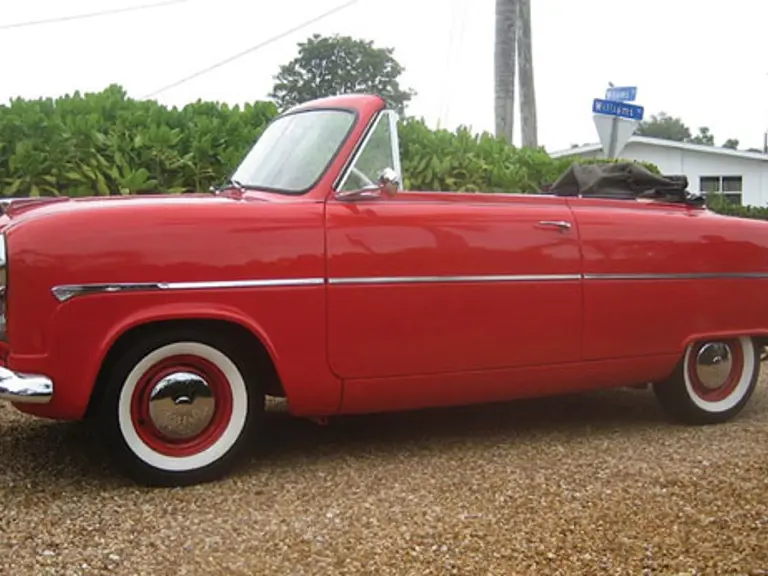 Owner states this example is one of 2800 convertibles made, has only 12,000 original miles, and its top and interior are both original. It is finished in red with a black top and grey interior with complementary red piping, all resting on wide whitewall tires.