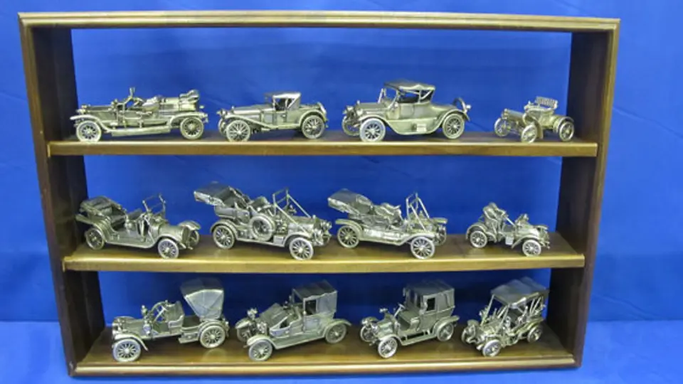 12-Sterling Silver Miniature Cars and Display Case 1/43 Scale