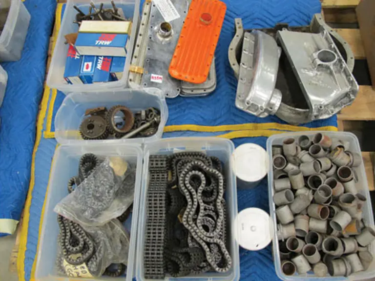 This lot contains miscellaneous timing chains, gears, valves, cam followers, water jacket housing, timing chain housing, and intake and exhaust valves.