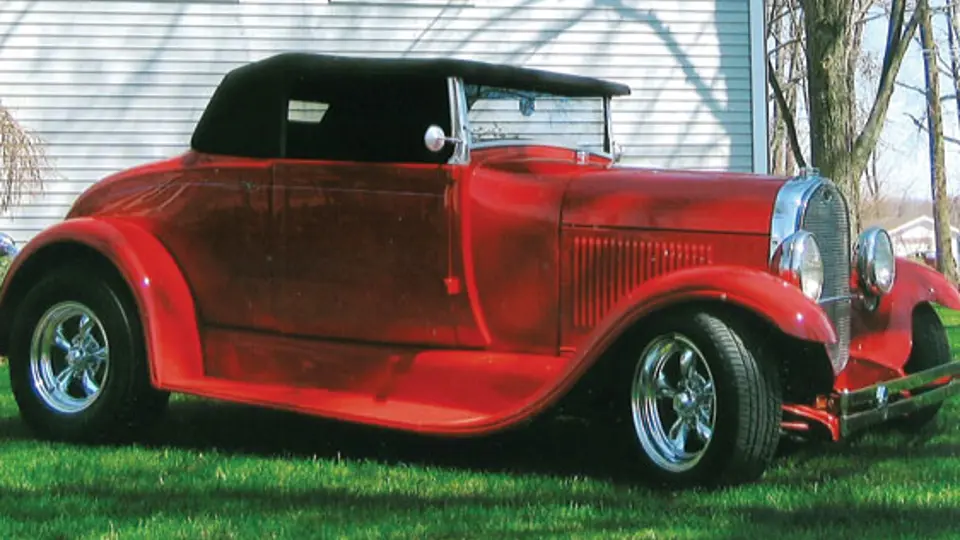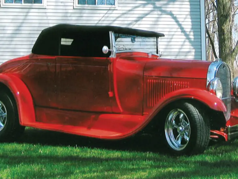 Built in 2004 in a street rod shop in Kentucky, this beautiful red Ford roadster features a 350-cid Chevrolet V-8 engine with a 350 Hydra-Drive automatic transmission with coil spring suspension. It sits high on thick rear tires perched on 5-spoke chrome wheels. It has approximately 7500 miles and is well detailed with twin headlamps, a chrome radiator cover, and gated grille guard.