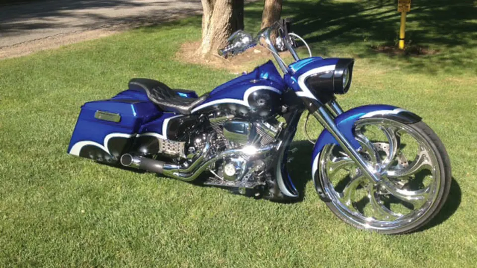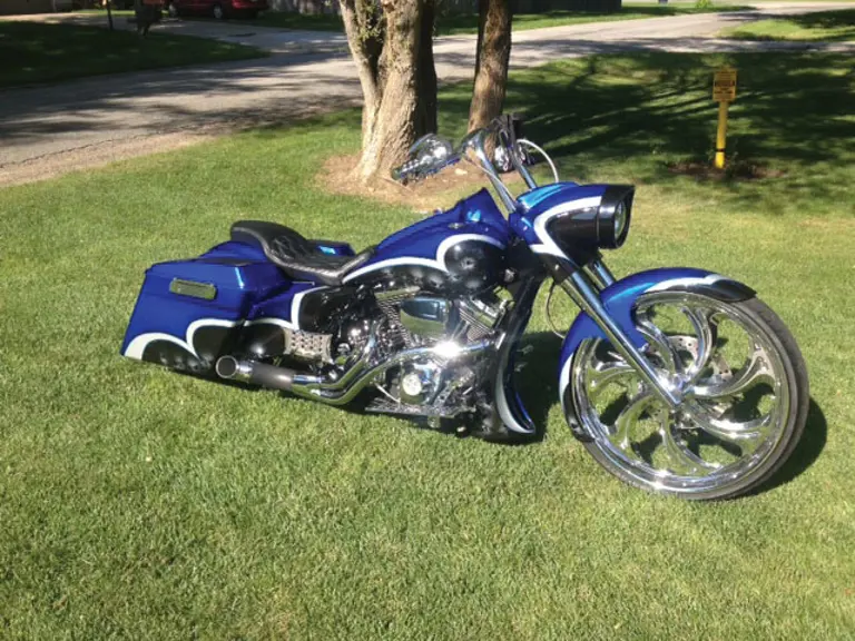 Powered by a 103-cid Twin Cam engine, this Custom Road King has been dyno-tuned and the owner claims nearly 108-hp at the rear wheel. Custom from the ground-up, the 2010 frame was completely stripped, painted and rebuilt. This Road King features Sinister Industries fenders, saddle bags and headlight bezel along with LA Choppers 14-inch Prime Mini Ape Hangers. The front wheel is a 26-inch Colorado Customs S7 at the cost of $5,000. Fox Designs in North Carolina completed the beautiful custom blue, black, and silver paintwork and the hand airbrushed detail in the skull illustration must be seen to be believed. The rear lighting is completely glassed in and incorporated to the Grim Reaper on the rear fender and the instrumentation is completely digital.