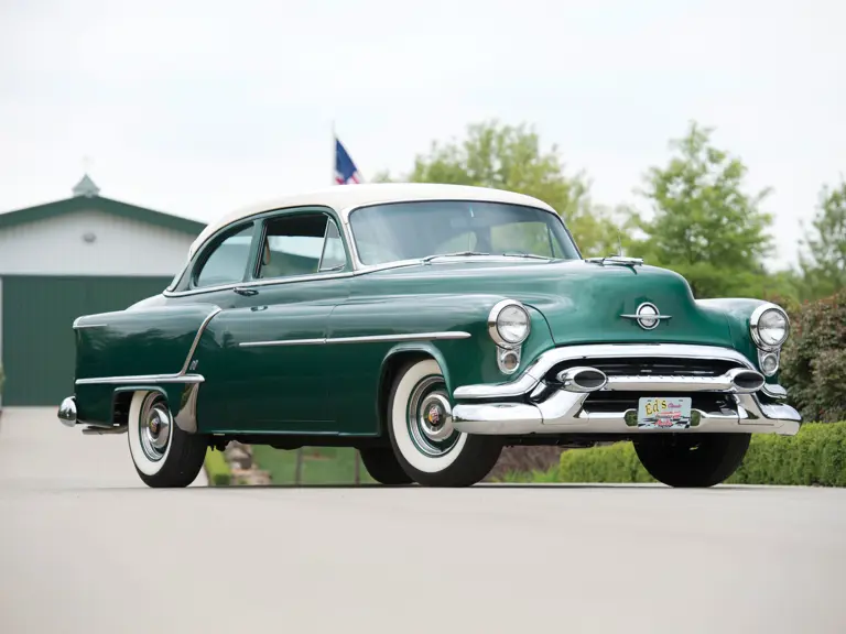 Presented in Polar White over Cove Green, the car has green and gray cloth upholstery, with matching green headliner and carpets. All contours and paint are very good, and the brightwork shows only modest age. It is equipped with radio, heater, clock and a tinted windshield. A brochure for the full 1953 Oldsmobile line is included.