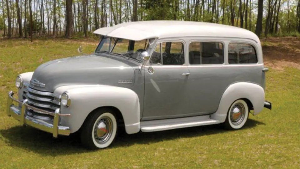 Perfect for car shows, camping or just drawing a crowd, this stunning eight-passenger Suburban has been fully restored from the ground up. It is fully accessorized with chrome grille guard, sun visor, spotlight and wide whitewall tires around artillery-styled wheels. Driving this vintage unit is a pleasure with upgraded power disc brakes, 12-volt electrical system, electric wipers and hidden sound system with CD player. The third row seat and heater will allow for comfy passengers as well. Finished in two-tone and highly detailed, it will please any Chevy enthusiast.